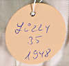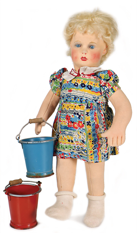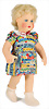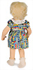 Puppe, Lizzy, hergestellt 1948, Artikel-Nr. 35, Filzpresskopf, eingesetzte, blaue Glasaugen, aufgemalter Mund, errötete Wangen, einges. gelockte, blonde Mohair-Haare, Filzkörper, kurzes geblümtes Kleidchen, 32 cm, unbespielter Orig.-Zustand, Handmuster aus dem STEIFF Archiv, mit original STEIFF Archiv-Plakette