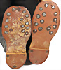 Russischer Soldat, Kosak, hergestellt 1915, Artikel-Nr. 35, mit Knopf, Druckbuchstaben, langgezogenes f, Schuhknopfaugen, Filzkopf, stark ausmodellierte Kinn- sowie Wangenpartie, sehr deutliches, starkes Airbrush, Schuhknopfaugen, Mohair-Kosakenhaube, khakifarbener Mantel, schwarze Lederstiefel mit16 Steiff Knöpfen, lederner Gürtel, 36 cm, unbespielter Orig.-Zustand, selten, Handmuster aus dem STEIFF Archiv, mit original STEIFF Archiv-Plakette