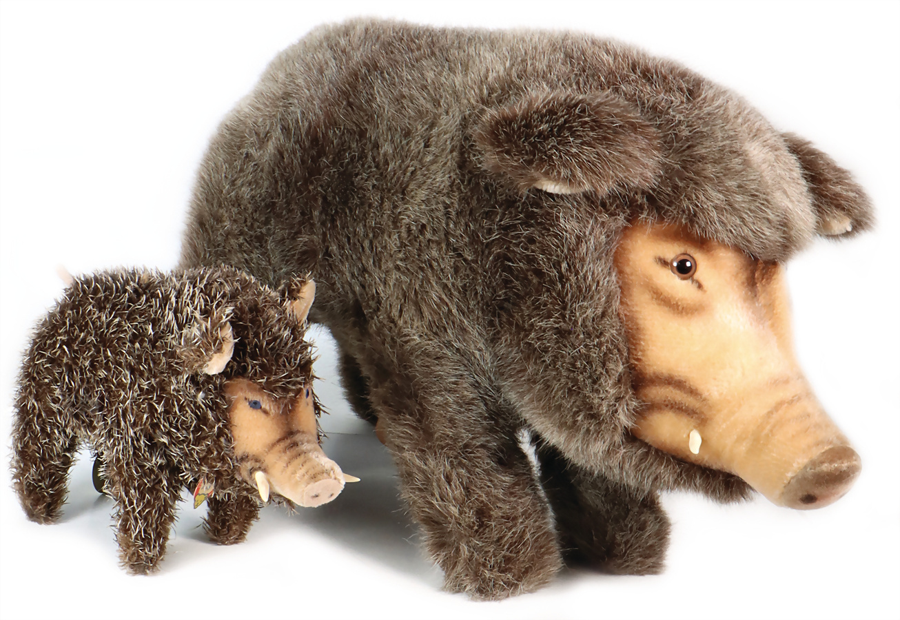 Wildschwein, Artikel-Nr. 2677/ 40, Knopf, Schild u. Fahne fehlen, Archiv-Anhänger, 1974, 60 cm, guter Zust., Wildschwein, Artikel-Nr. 1320/ 03, mit Brustschild, Archiv-Anhänger, 1968, 28 cm, guter Zust., Handmuster aus dem STEIFF Archiv mit orig. STEIFF Archiv-Anhänger
