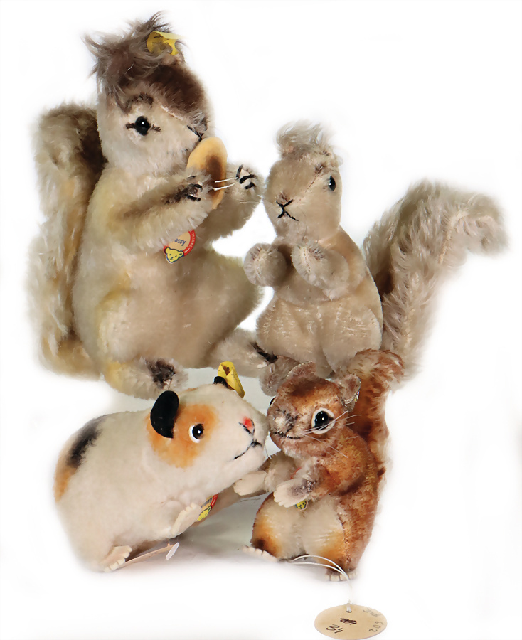 Konv. 4 Artikel, Possy, Eichhörnchen, Artikel-Nr. 4322, 05, kompl., silberner Knopf, gelbe Fahne, Archiv-Anhänger, 1961, sehr guter Zust., 18 cm, Swinny, Meerschweinchen, Artikel-Nr. 2250/ 09, kompl., silberner Knopf, gelbe Fahne, Archiv-Anhänger, 1969, guter Zust., 12 cm, Eichhörnchen, Possy, Archiv-Anhänger, 1957, guter Zust., 12 cm, Eichhörnchen, Perry, Knopf u. Schild, Fahne fehlt, silberner Knopf, Archiv-Anhänger, 1967, Artikel-Nr. 2040/ 12, guter Zust., 9 cm, Handmuster aus dem STEIFF Archiv, mit orig. STEIFF Archiv-Anhänger