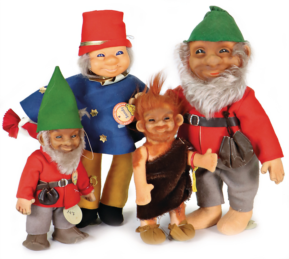 Konv. 4 Artikel, Sandy, Puppe, Artikel-Nr. 8729, 70, kompl., silberner Knopf, gelbe Fahne, Archiv-Anhänger, 1965, 30 cm, sehr guter Zust., Ur-Mensch, Artikel-Nr. 7755/ 19, Brustschild fehlt, mit Knopf u. gelber Fahne, Archiv-Anhänger, 1968, 19 cm, guter Zust., Pucki, Artikel-Nr. 7670/ 18, kompl., silberner Knopf u. gelbe Fahne, Archiv-Anhänger, 1968, 18 cm, guter Zust., Pucki, Artikel-Nr. 7670/ 20, Knopf, Schild u. Fahne fehlen, Archiv-Anhänger, 1967, 30 cm, Tasche etw. abgerieben, sonst gut, Handmuster aus dem STEIFF Archiv, mit orig. STEIFF Archiv Anhänger