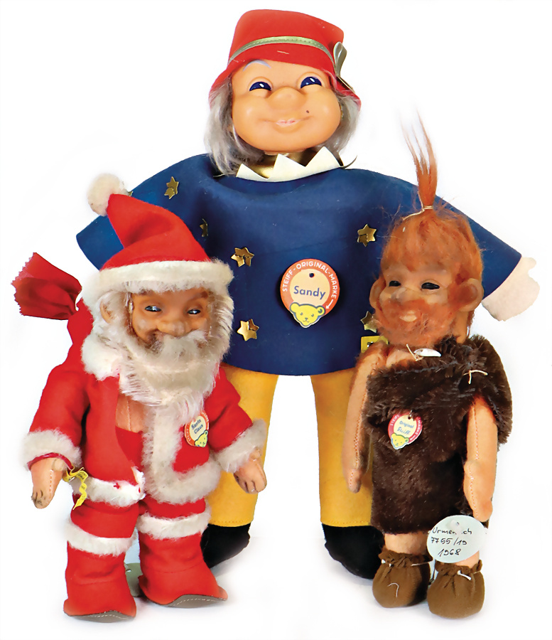 Konv. 3 Artikel. Ur-Mensch, Artikel-Nr. 7755/ 19, mit Schild, Archiv-Anhänger, 1968, 20 cm, guter Zust., Santa Claus, kompl., silberner Knopf, gelbe Fahne, Artikel-Nr. 8018, 08, Archiv-Anhänger, 1956, 20 cm, guter Zust., Sandy, Artikel-Nr. 8729, 70, kompl., silberner Knopf, gelbe Fahne, Archiv-Anhänger, 1965, 30 cm, sehr guter Zust., Handmuster aus dem STEIFF Archiv, mit orig. STEIFF Archiv-Anhänger