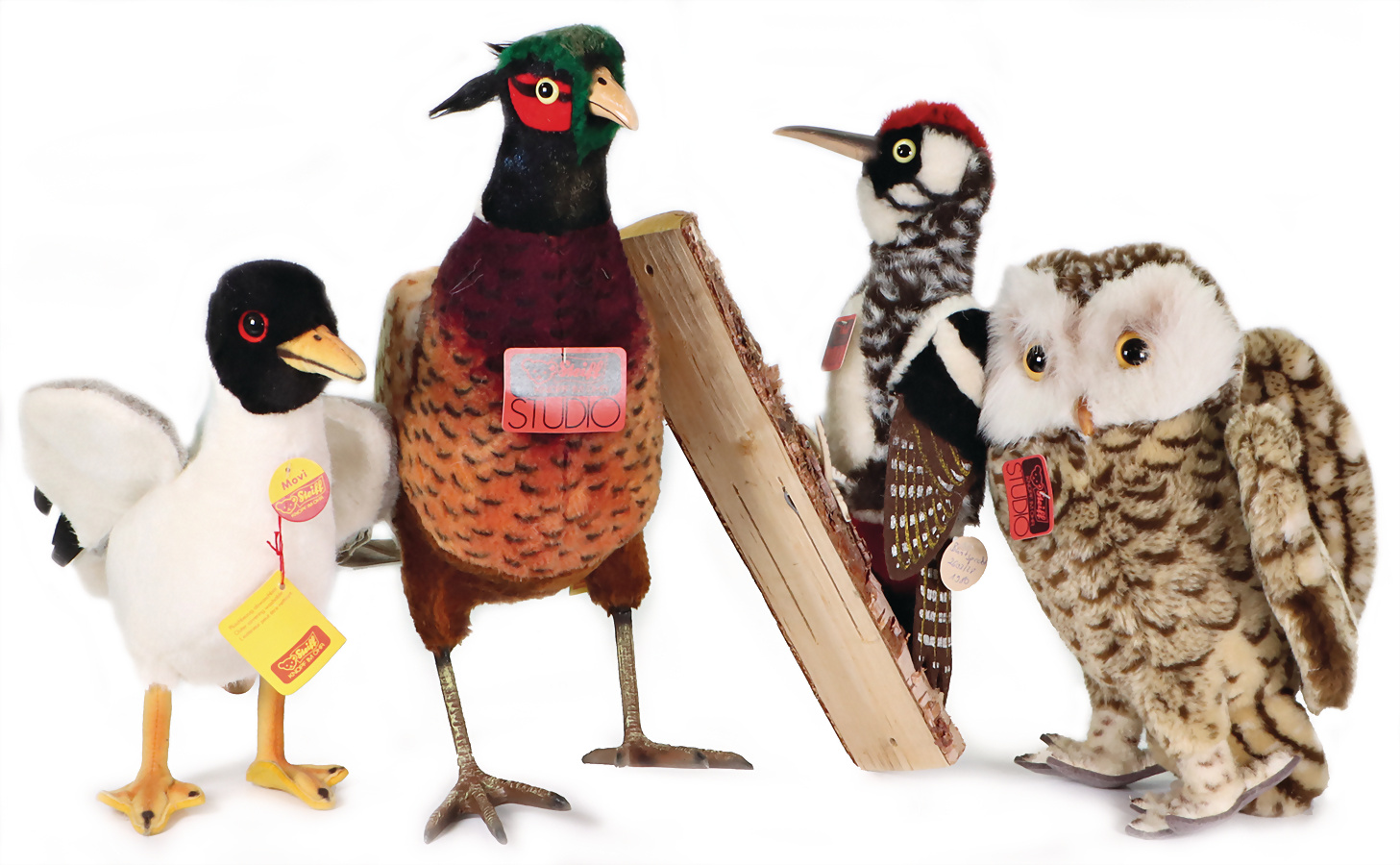 Studiotiere Vögel, Fasan, Artikelnr. 2622/ 40, 1979, gelber Knopf, gelbe Fahne, Papier-Anhänger Studio, Studiotier Kautz, Artikelnr. 2593/ 28, 1981, ohne Knopf, mit Papier-Anhänger Studio, Buntspecht, Artikelnr. 2603/ 28, 1980, auf Baumstamm montiert, ohne Knopf, mit Papier-Anhänger Studio, Möwe, Artikelnr. 2525/ 28, 1979, ohne Knopf, mit Schild: Möwi, sehr guter unbespielter Zust., Handmuster aus dem Steiff-Archiv mit orig. Steiff-Archiv Anhänger