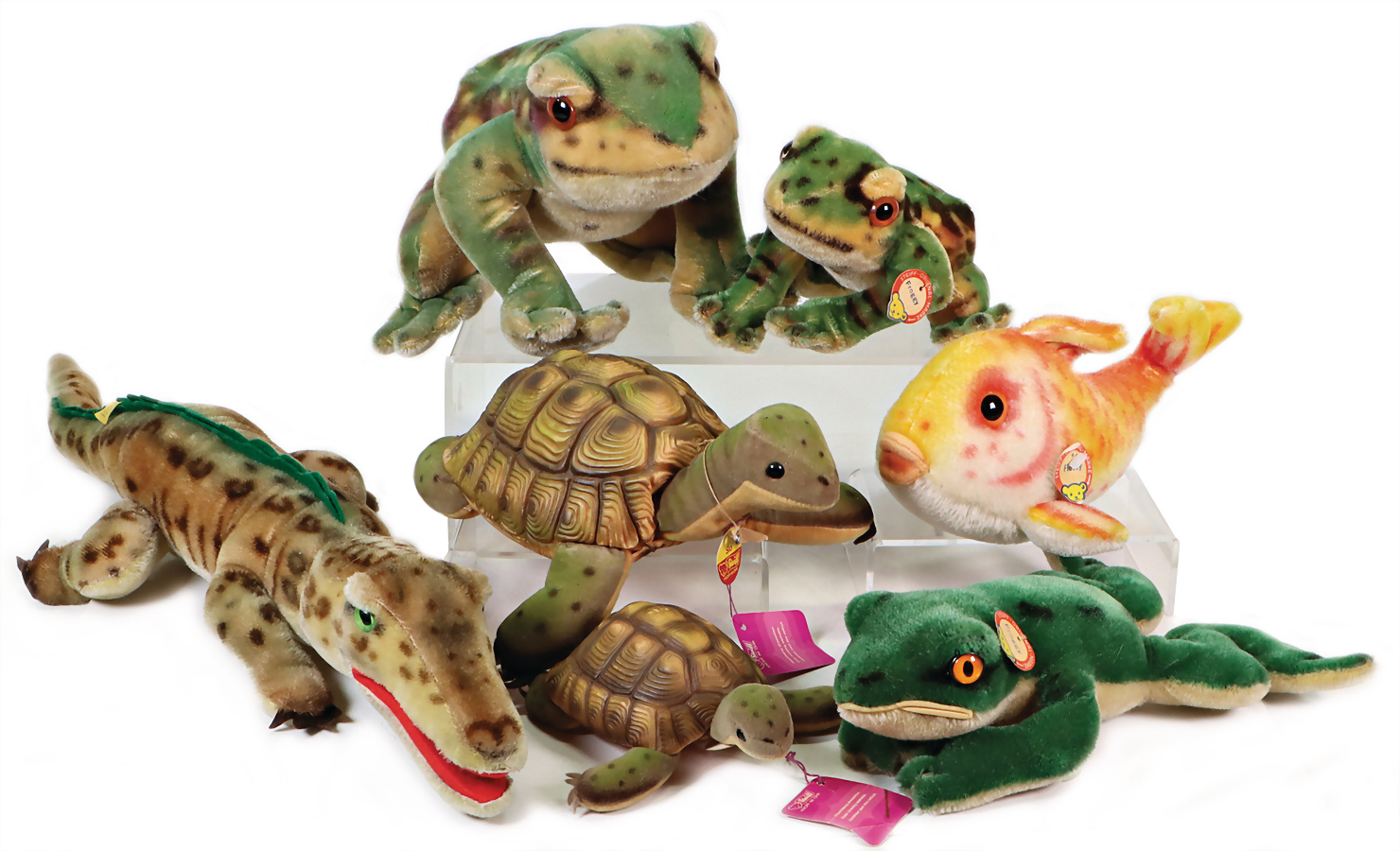 Konv. 50/60er Jahre, Frosch FROGGY, Artikelnr. 3328, 00, 1959, ohne Knopf und Schild, Frosch FROGGY, Artikelnr. 2322, 00, 1962, mit Knopf und Schild, Frosch FROGGY, Artikelnr. 3322, 00, 1960, mit Schild, SLO Schildkröte, Artikelnr. 2455/ 22, 1976, SLO Schildkröte, Artikelnr. 2455/ 22, 1976, mit Schild, FLOSSY Goldfisch, Artikelnr. 2322, 01, 1960, mit Schild, GATY, Artikelnr. 2330, 1957, mit Knopf und Fahne, Fahne etwas verschlissen, sonst sehr guter unbespielter Zust., Handmuster aus dem Steiff-Archiv mit orig. Steiff-Archiv Anhänger