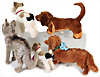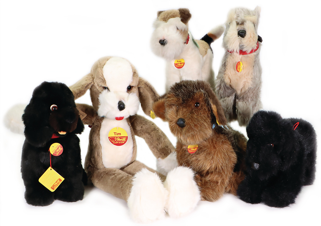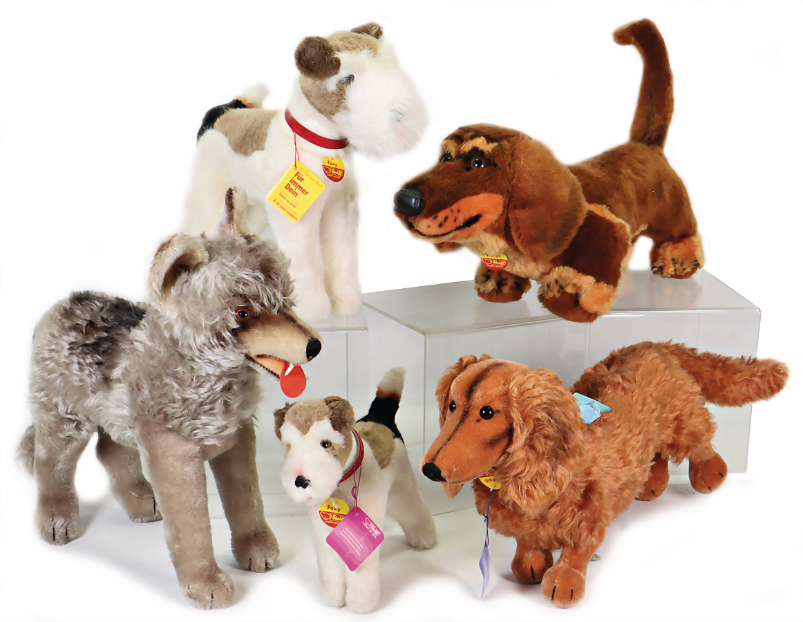 Konv. Hunde, WALDI Dackel, Artikelnr. 4142/ 28, 1976, mit Schild, WALDI Dackel, Artikelnr. 4140/ 28, 1975, mit Knopf und Schild FOXY Terrier, Artikelnr. 4215/ 22, 1977, mit Schild, FOXY Terrier, Artikelnr. 4215/ 30, 1977, komplett, Wolf, Artikelnr. 1335, 00, 1964, an einer Pfote etwas offen, sonst sehr guter unbespielter Zust., ohne Knopf und Schild, Handmuster aus dem Steiff-Archiv mit orig. Steiff-Archiv Anhänger