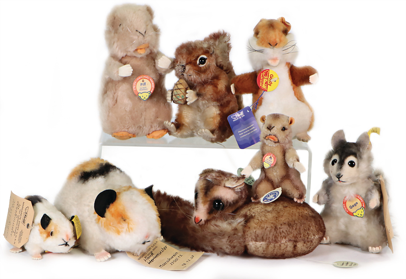 Konv. GOGO, komplett, Nr. auf Fahne: 4615.00, mit Werkmuster-Anhänger, CHINCHILLA, 1965, Meerschwein, Artikelnr. 2250/ 12, mit Schild, SWINNY, mit Archiv-Anhänger: Handmuster, 1967, PIFF Murmeltier, Artikelnr. 2200/ 17, mit Schild, Archiv-Anhänger, 1972, GOLDI, Artikelnr. 2155/ 17, Archiv-Anhänger: Handmuster 1975, DORMY Siebenschläfer, Artikelnr. 2220/ 20, Archiv-Anhänger: 1967, Eichhörnchen PERRI, Artikelnr. 2040/ 17, Archiv-Anhänger: 1968, SWINNY, komplett, Meerschwein, Artikelnr. 2250/ 09, mit Werkmuster-Anhänger: 1976, PIFF Murmeltier, Artikelnr. 4310.00, mit Schild, Archiv-Anhänger: 1965, sehr guter unbespielter Zust., Handmuster aus dem Steiff-Archiv mit orig. Steiff-Archiv Anhänger