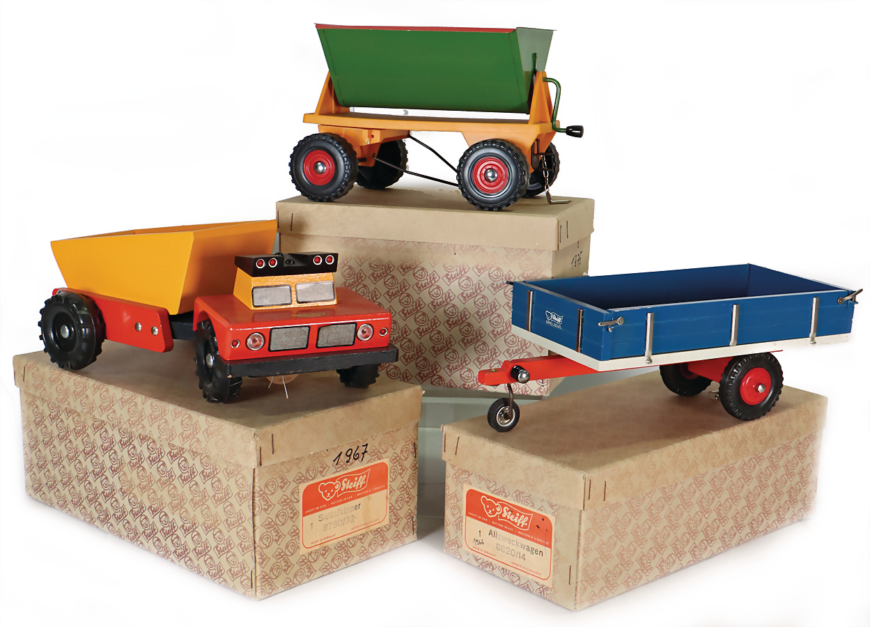 Muldenkipper, Artikelnr. 8860/ 17, mit Archiv-Anhänger 1975, Allzweckwagen, Artikelnr. 8820/ 14, Sattelschlepper, Artikelnr. 8750/ 32, Archiv-Anhänger: 1976, eingeliefert aus dem Steiff-Archiv, alle neuw. orig.-Kart.