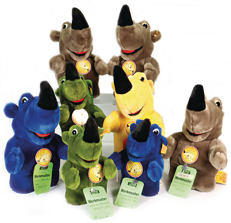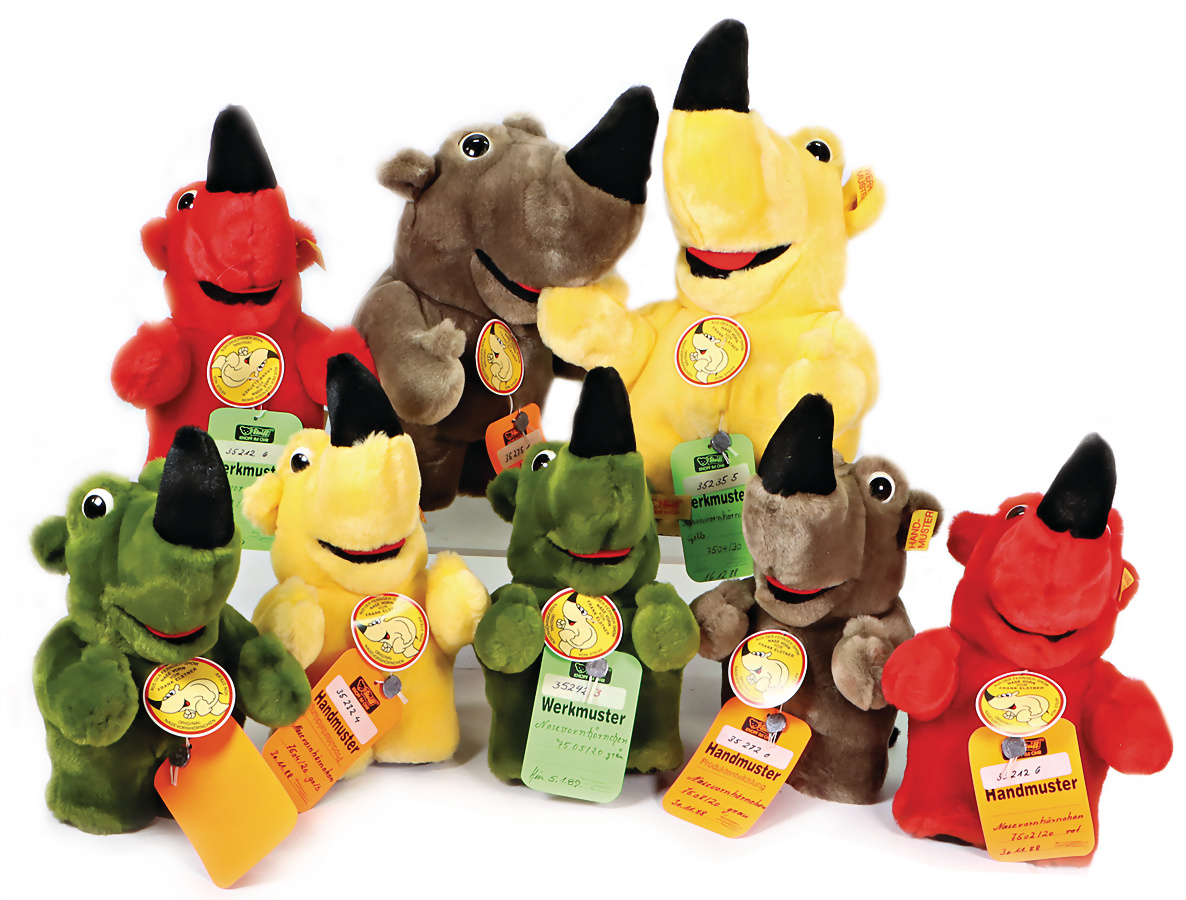 Konv. Nasevornhörnchen, gelb, Artikelnr. 7504/ 30, aus der Fernseh-Show: Nase vorn von Frank Elstner, gelber Knopf, gelbe Fahne, Aufdruck: Werkmuster, mit Werkmusteranhänger, Nasevornhörnchen, gelb, Artikelnr. 7504/ 20, Nasevornhörnchen, Artikelnr. 7508/ 20, grau, Nasevornhörnchen, Artikelnr. 7508/ 30, grau, Nasevornhörnchen, Artikelnr. 7505/ 20, grün, 2x Nase vornhörnchen, Artikelnr. 7502/ 20, rot, Nasevornhörnchen, Artikelnr. 7505/ 20, grün, alle komplett, Fahne rückseitig bedruckt: Handmuster, mit Handmuster-Anhänger, unbespielter orig.-Zust., Handmuster aus dem Steiff-Archiv mit orig. Steiff-Archiv Anhänger