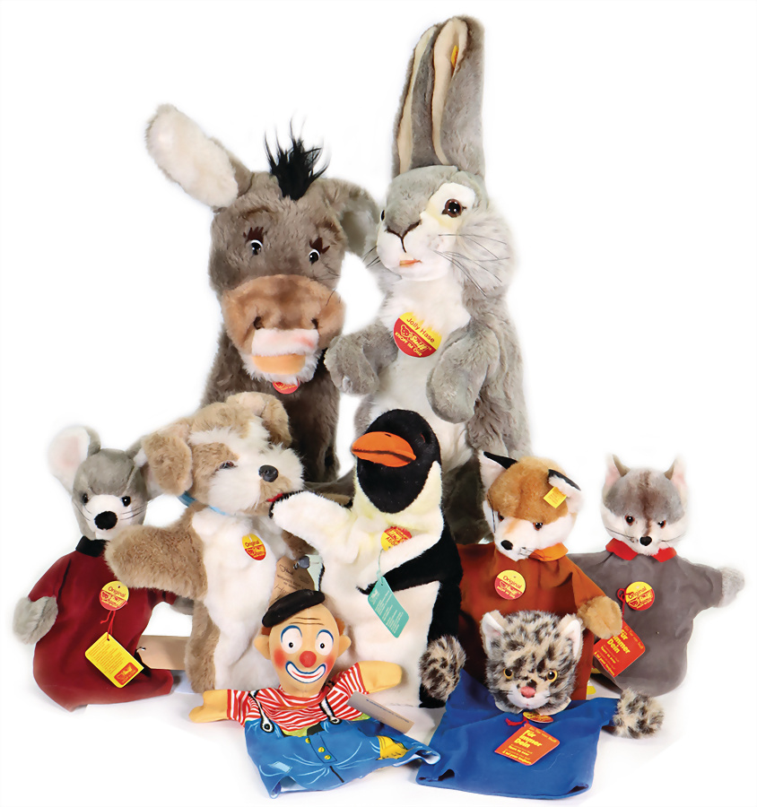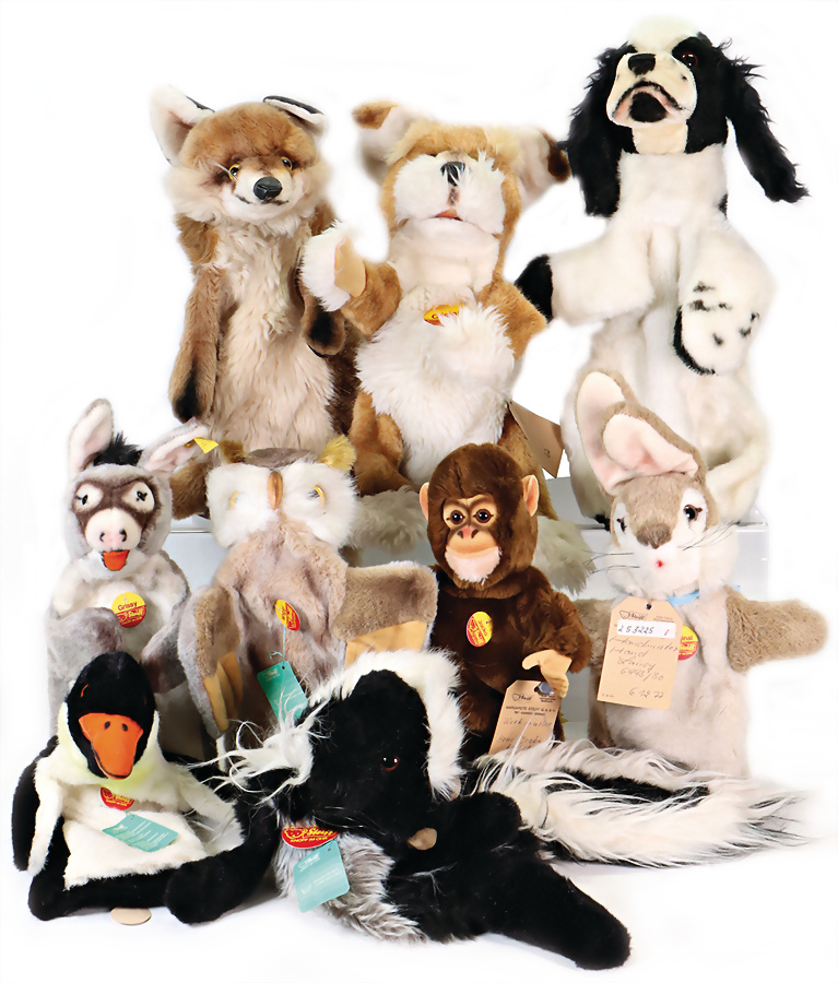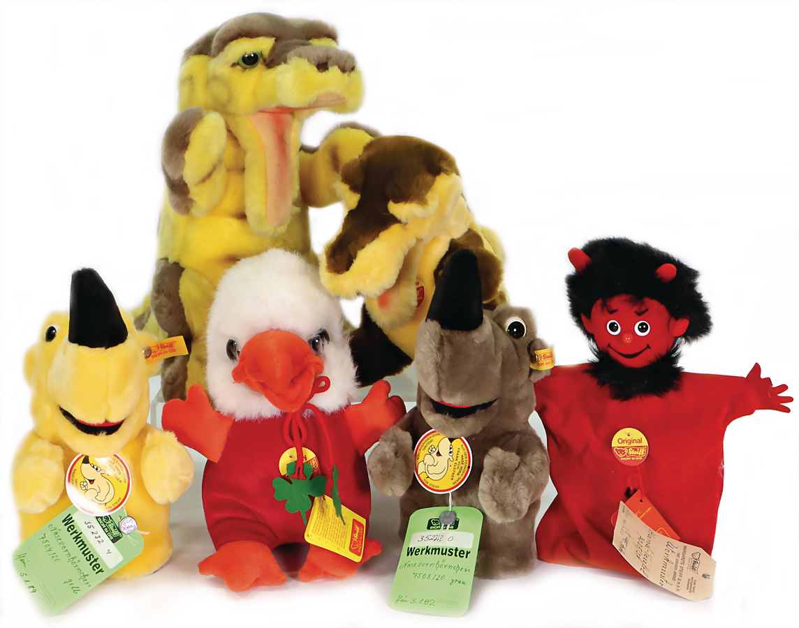 Konv. Handpuppen, MIMIC-Hund, Artikelnr. 3492/ 45, mit Schild, mit Werkmuster-Anhänger 1982, DOLLY Fuchs, Artikelnr. 3482 /50, ohne Knopf und Schild, mit Archiv-Anhänger: 1973, JOLLY STUNK, Artikelnr. 3476/ 40, mit Schild, Archiv-Anhänger: 1977, LAUSY, Artikelnr. 6993/ 30, mit Schild, mit Archiv-Anhänger: Handmuster, JOCKO, Artikelnr. 6991/ 30, mit Anhänger: Werkmuster 1984, mit Schild, DOLLY COCKIE, Artikelnr. 3486/ 50, ohne Knopf und Schild, Archiv-Anhänger: 1973, PEGGY Pinguin, Artikelnr. 6997/ 30, Archiv-Anhänger: 1978, WIGGI, Artikelnr. 6995/ 30, mit Schild, mit Archiv-Anhänger: 1978, GRISSY, komplett, Artikelnr. 6996/ 30, Archiv-Anhänger: 1978, sehr guter unbespielter Zust., Handmuster aus dem Steiff-Archiv mit orig. Steiff-Archiv Anhänger