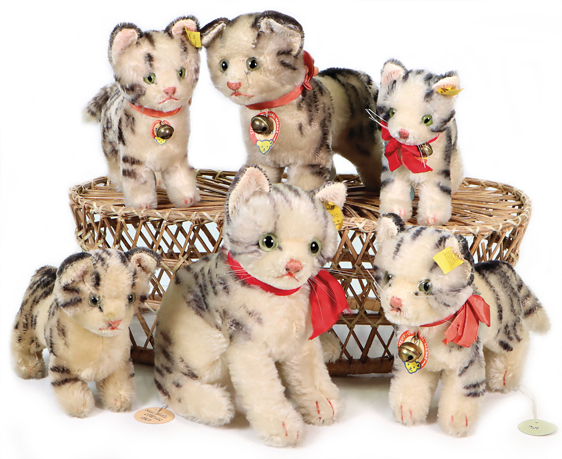 Konv. Katzen, SUSI, Artikelnr. 2780/ 22, Knopf und Fahne, Archiv-Anhänger: 1967, TABBY-Katze, Artikelnr. 1314.00, komplett, Archiv-Anhänger: 1960, TABBY-Karte, Artikelnr. 1317, Archiv-Anhänger: 1968, TABBY-Katze, komplett, Artikelnr. 1317, Archiv-Anhänger: 1968, Katze ohne Knopf und Schild, Artikelnr. 1314.00, Archiv-Anhänger: 1960, TABBY-Katze, Artikelnr. 2700/ 14, komplett, Archiv-Anhänger, 1968, unbespielter sehr guter Zust., Handmuster aus dem Steiff-Archiv mit orig. Steiff-Archiv Anhänger