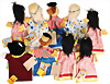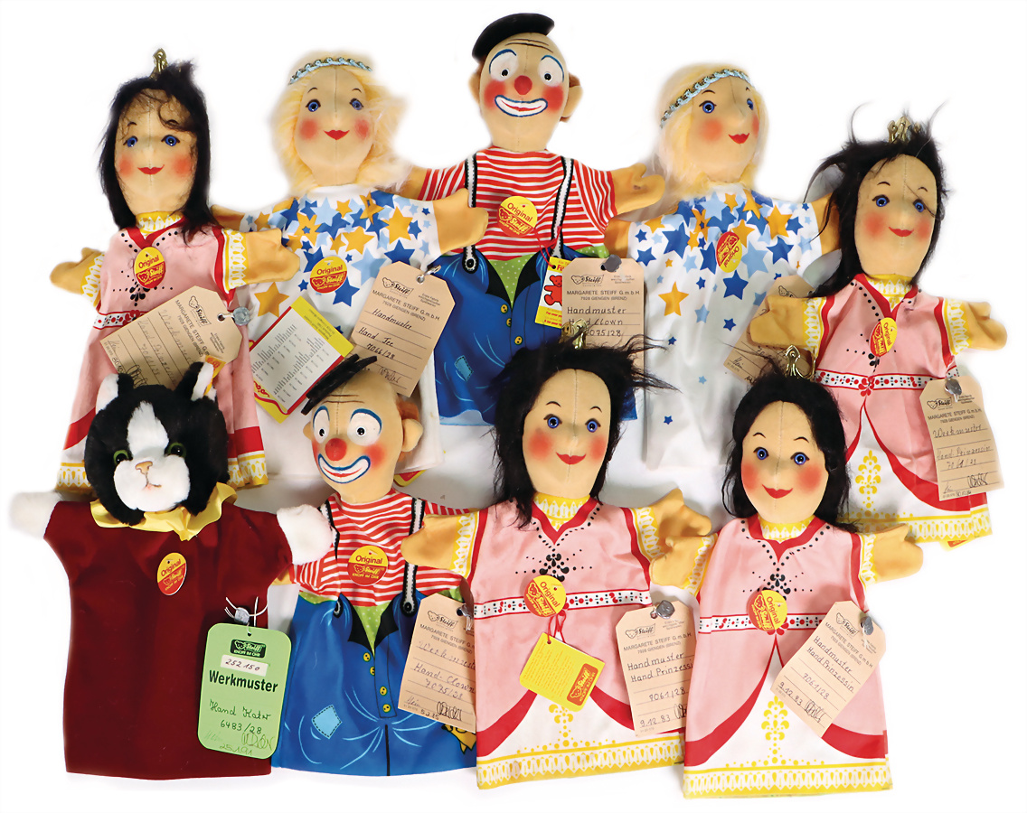 Konv. 9 Artikel, 4x Handspielpuppe, Prinzessin, Artikel-Nr. 7061/ 28, mit Brustschild, Handmuster-Schild, u. Metall-Siegel, 33 cm, sehr guter Zust., 2x Handspielpuppe, Fee, Artikel-Nr. 7066/ 28, mit Brustschild, Werkmuster-Schild u. Metall-Siegel, 30 cm, guter Zust., 2x Handspielpuppe, Clown, Artikel-Nr. 7075/ 28, mit Brustschild, Werkmuster-Schild u. Metall-Siegel, sehr guter Zust., Handspielpuppe, Kater, Artikel-Nr. 6483/ 28, mit Brustschild, goldenem Knopf u. gelber Fahne, Aufdruck Werkmuster, Werkmuster-Schild u. Metall-Siegel, 30 cm, sehr guter Zust., Handmuster aus dem STEIFF Archiv, mit orig. STEIFF Archiv-Anhänger