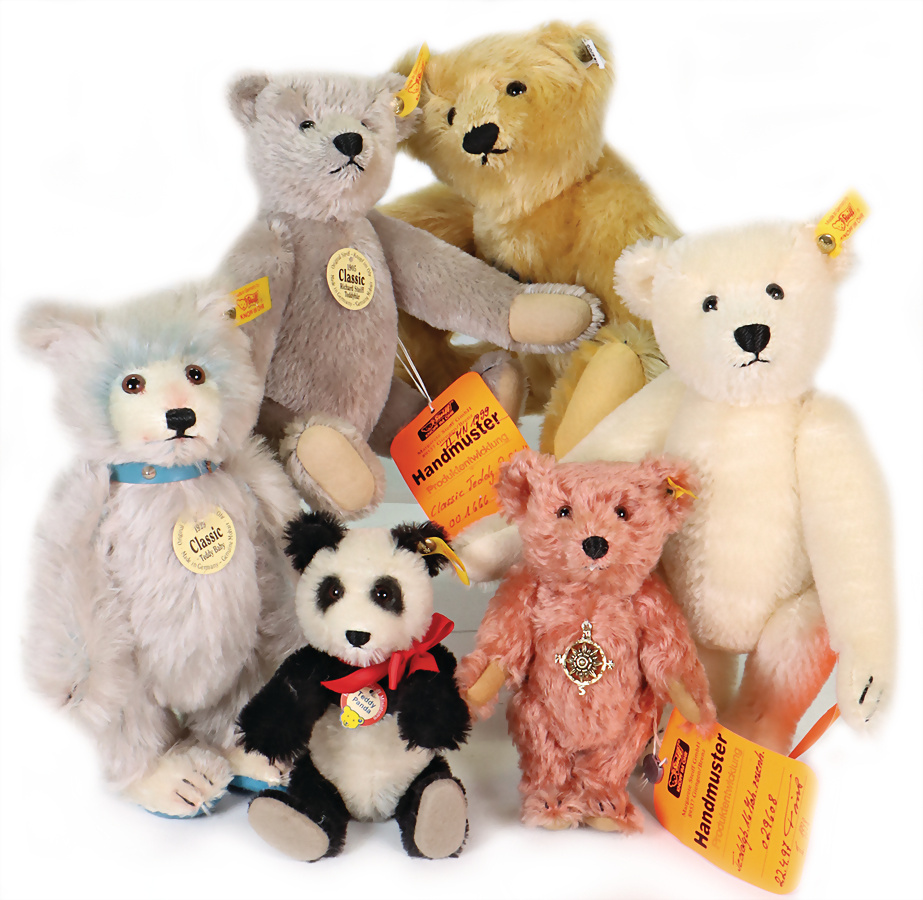 Konv. 6 Artikel, Teddy-Panda, Artikel-Nr. 029905, mit Brustschild, goldenem Knopf, gelbe Fahne, Aufdruck Handmuster, mit Archiv-Anhänger, 1993, 15 cm, Teddy-Baby, Artikel-Nr. 006425, mit Brustschild, goldenem Knopf u. gelber Fahne, mit Archiv-Anhänger, 1999, 25 cm, sehr guter Zust., Bär, Replica, mit Brustschild, goldenem Knopf, weiße Fahne, Artikel-Nr. 01721, Made in West Germany, Limited Edition, mit Archiv-Anhänger, 1984, guter Zust., Classic-Teddy-Bär, Richard STEIFF, Artikel-Nr. 001666, mit Brustschild, goldenem Knopf, gelber Fahne, Aufdruck Handmuster, mit Handmuster-Schild u. Metall-Siegel, 26 cm, sehr guter Zust., Bär, Artikel-Nr. 029608, mit goldenem Knopf u. gelber Fahne, Aufdruck Handmuster, mit Handmuster-Schild u. Metall-Siegel, 16 cm, sehr guter Zust., Classic-Teddy-Bär, Richard STEIFF, Artikel-Nr. 001604, mit goldenem Knopf u. gelber Fahne, Aufdruck Handmuster, Handmuster-Schild u. Metall-Siegel, guter Zust., 26 cm