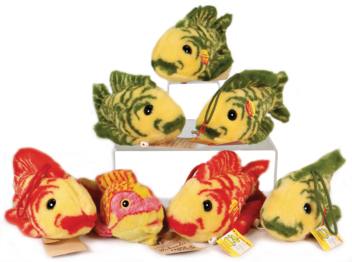 Konv. 7 Artikel, 4x Musik-Flossy, Fisch, Artikel-Nr. 6368/ 20, mit Brustschild, Handmuster-Schild, mit Metall-Siegel, 1985, 23 cm, sehr guter Zust., Musikspielwerk intakt, 2x Musik-Flossy, Artikel-Nr. 6367/ 20, mit Brustschild, Werkmuster-Schild u. Metall-Siegel, 23 cm, sehr guter Zust., Musikspielwerk intakt, Zappy, Musikfisch, Artikel-Nr. 6377/ 20, mit Schild, Werkmuster-Anhänger, u. Metall-Siegel, Musikspielwerk intakt, 18 cm, Handmuster aus dem STEIFF Archiv, mit orig. STEIFF Archiv-Anhänger