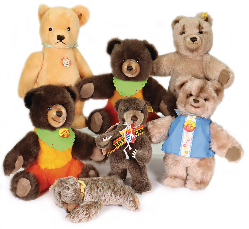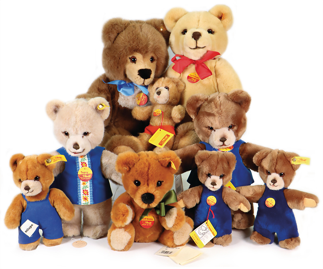 Konv. 9 Artikel, Toldi Bär, Artikel-Nr. 6242/ 20, Brustschild, goldener Knopf, gelbe Fahne, mit Handmuster-Schild u. Metall-Siegel, 20 cm, guter Zust., Toldi, Brustschild, Artikel-Nr. 6242/ 20, Tapsy Bär für Milupa, Artikel-Nr. 7967/ 22, goldener Knopf u. gelbe Fahne, Knöpfchen, Artikel-Nr. 0218/ 16, mit Brustschild, Bobby, mit Brustschild, goldenem Knopf u. gelber Fahne, Aufschrift Werkmuster, Artikel-Nr. 023309, 28 cm, Tapsy, mit Brustschild, Knopf u. Fahne, Artikel-Nr. 6210/ 30, Toldy, Artikel-Nr. 6242/ 30, Brustschild, 30 cm, Bobby, Artikel-Nr. 023224, mit Brustschild, goldenem Knopf u. gelber Fahne, Aufschrift Handmuster, Handmuster-Schild mit Metall-Siegel, 38 cm, Molly-Teddy, Artikel-Nr. 0331/ 48, mit Brustschild, goldenem Knopf, gelber Fahne, Aufschrift Werkmuster, Archiv-Anhänger, 1991, 45 cm, sehr guter Zust., Handmuster aus dem STEIFF Archiv, mit orig. STEIFF Archiv-Anhänger