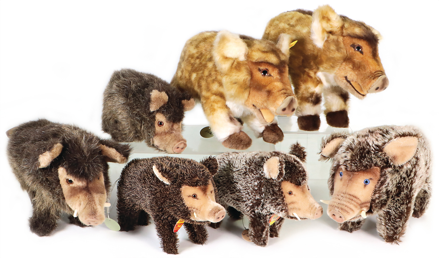 Konv. 7 Artikel, 2x Suggy, Frischling, Artikel-Nr. 2677/ 30, mit Schild, 1x mit Schild, goldener Knopf, gelbe Fahne, mit Archiv-Anhänger, 1983, 30 cm, Dalle, Wildschwein, mit Brustschild, silberner Knopf, gelbe Fahne, Artikel-Nr. 2670/ 15, 22 cm, Wildschwein, Artikel-Nr. 2670/ 15, mit Brustschild, 21 cm, guter Zust., Wuzi, Artikel-Nr. 2675/ 15, mit Schild, Metall-Siegel, 22 cm, guter Zust., Wuzi, Artikel-Nr. 2675/ 20, mit Schild, Metallsiegel und Stoßzähnen, 28 cm, guter Zust., Wildschwein, Artikel-Nr. 2670/ 20, mit Brustschild, 28 cm. guter Zust., Handmuster aus dem STEIFF Archiv, mit orig. STEIFF Archiv-Anhänger