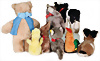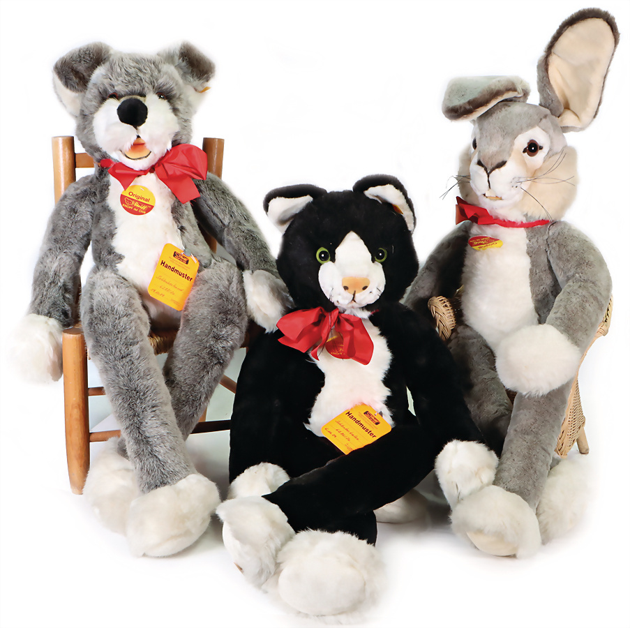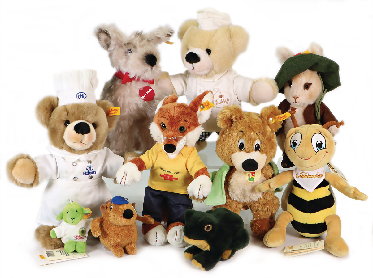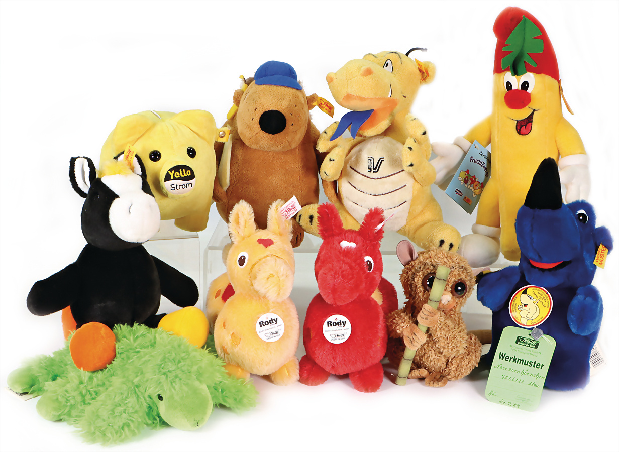 Konv. Nachkrieg, Stand-BONZO, mit Schild, Anhänger mit Siegel, Artikelnr. 6994/ 30, Jannik-Esel, mit Schild, Artikelnr. 6485/ 35, Archiv-Anhänger: 1973, JOLLY-Hase, komplett, gelbe Fahne, rückseitig Aufdruck: Handmuster, Anhänger mit Siegel: Handmuster Produktionsentwicklung 1987, PEGGY, mit Schild, Artikelnr. 6997/ 30, Archiv-Anhänger: 1978, Hand-Mieze- Katze, mit Schild, Artikelnr. 6466/ 27, Archiv-Anhänger: 1979, Hand-Fuchs, komplett, Artikelnr. 6472/ 27, Archiv-Anhänger: 1979, Hand-Wolf, mit Schild, Artikelnr. 64721/ 27, Archiv-Anhänger: 1979, Hand-Maus, Anhänger mit Siegel: Werkmuster, Artikelnr. 64667/ 27, 1983, Hand-Clown, mit Schild, Anhänger mit Siegel: Werkmuster, Artikelnr. 7075/ 28, 1985, neuw. Zust., Handmuster aus dem Steiff-Archiv mit orig. Steiff-Archiv Anhänger
