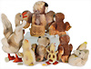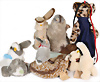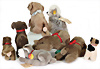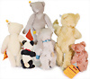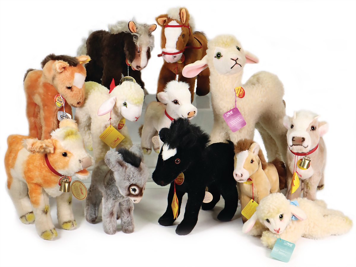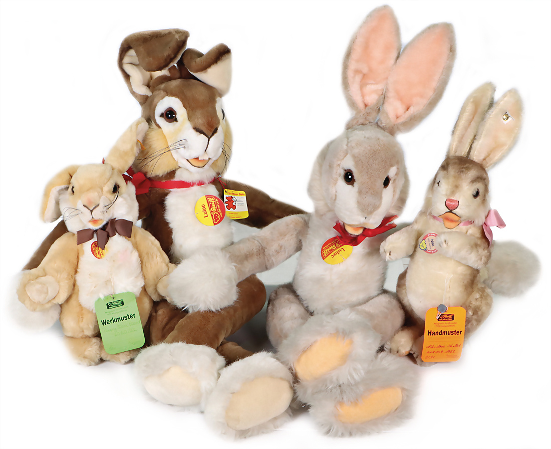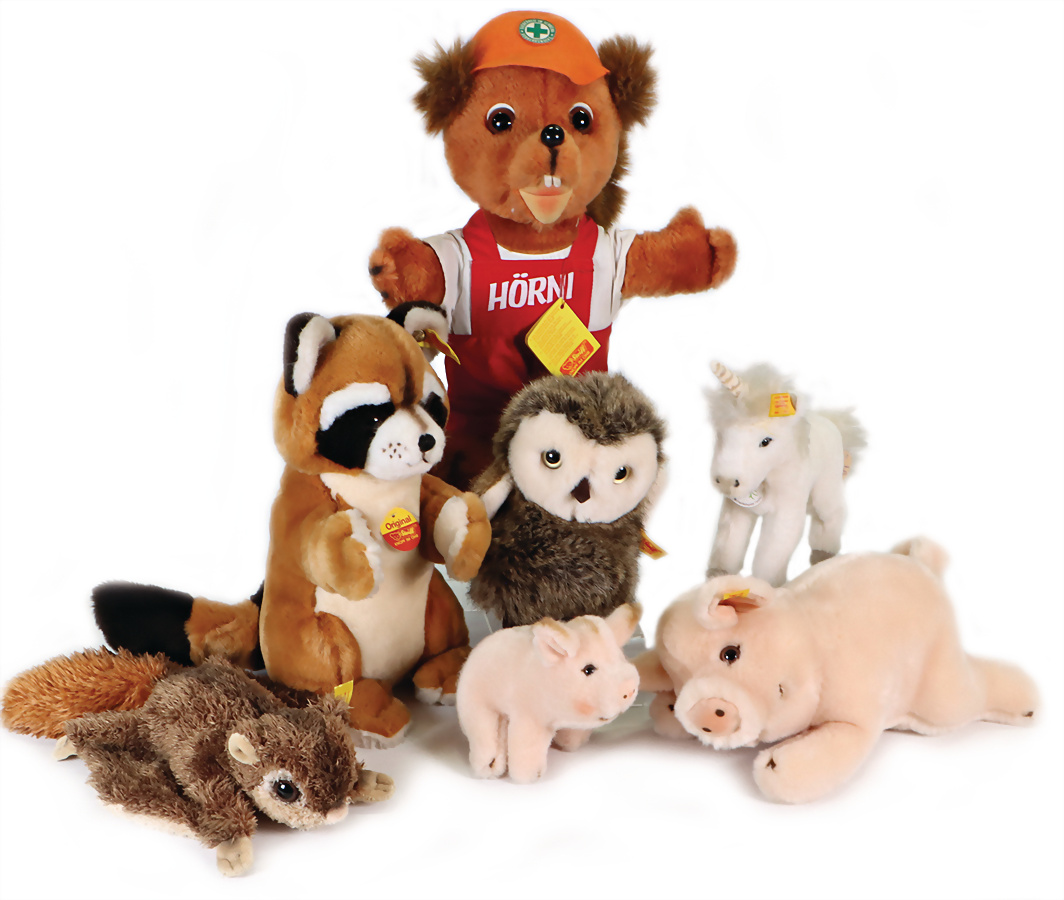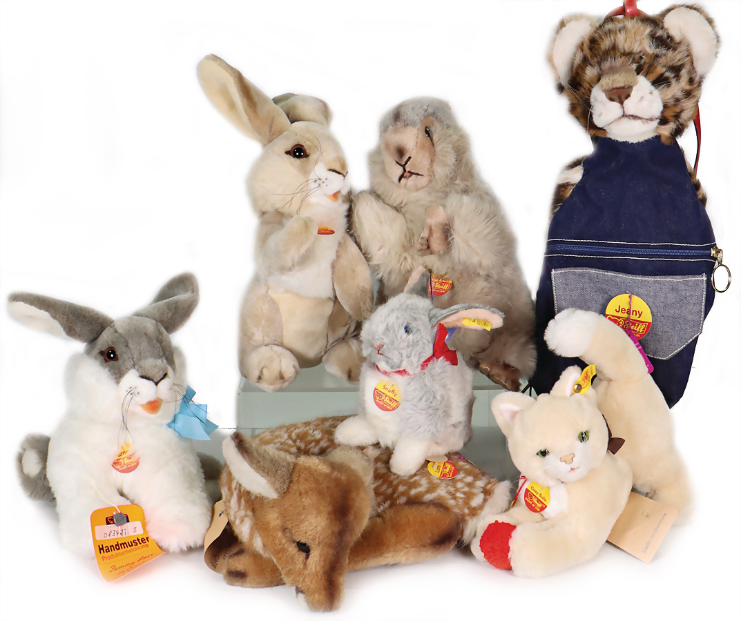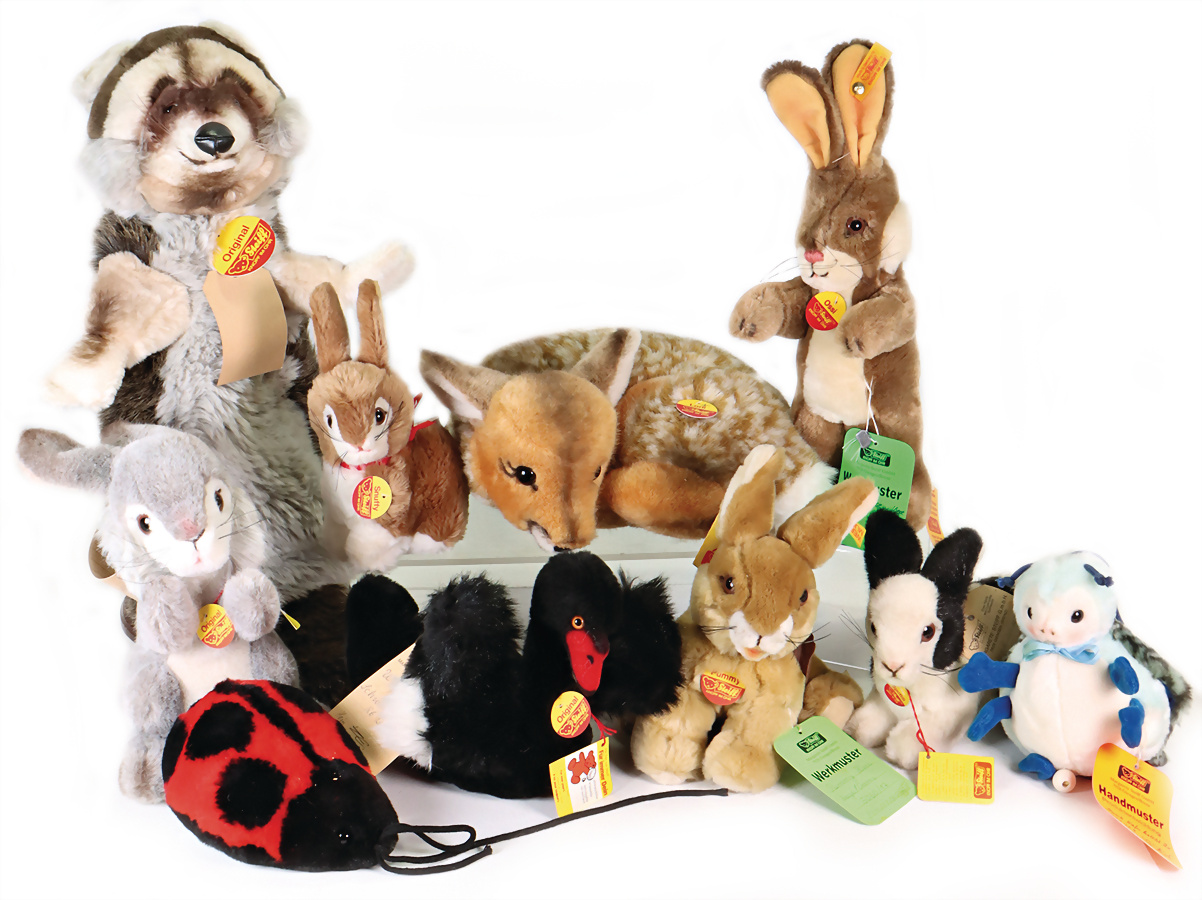 Konv., 10 Teile, Hasen, Reh, liegend, Schwan, Spieluhr, Marienkäfer, Waschbär, Hase Snuffy, sehr guter unbespielter Zust., Handmuster aus dem STEIFF Archiv mit Orig.-STEIFF Archiv-Anhänger