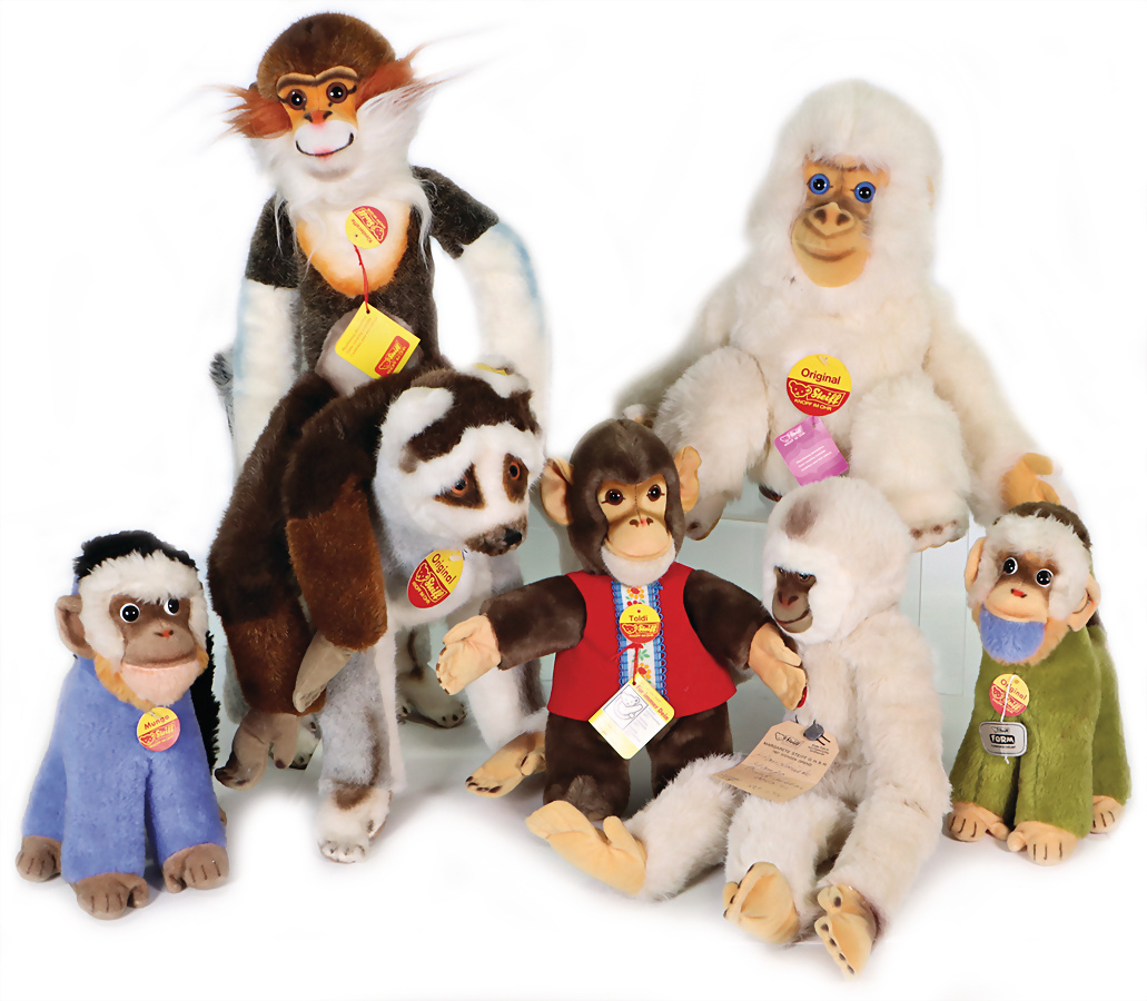 Konv. Nachkrieg, KATTA, komplett, Artikelnr. 0059/ 06, Archiv-Anhänger: 1978, GORILLA, mit Schild, Artikelnr. 0028/ 45, Archiv-Anhänger: 1976, HANGO, Anhänger mit Siegel Aufschrift: Handmuster, Artikelnr. 0040/ 45, Archiv-Anhänger: 1979, MUNGO mit Schild, Artikelnr. 6421/ 35, Archiv-Anhänger: 1972-77, Mund, Affe, Knopf und Schild, Artikelnr. 6420/ 25, Archiv-Anhänger: 1971, Kleider-Affe, mit Schild, Artikelnr. 0045/ 50, Archiv-Anhänger: 1980, TOLDI, mit Schild, Artikelnr. 6240/ 30, Archiv-Anhänger: 1982, sehr guter unbespielter Zust., Handmuster aus dem Steiff-Archiv mit orig. Steiff-Archiv Anhänger