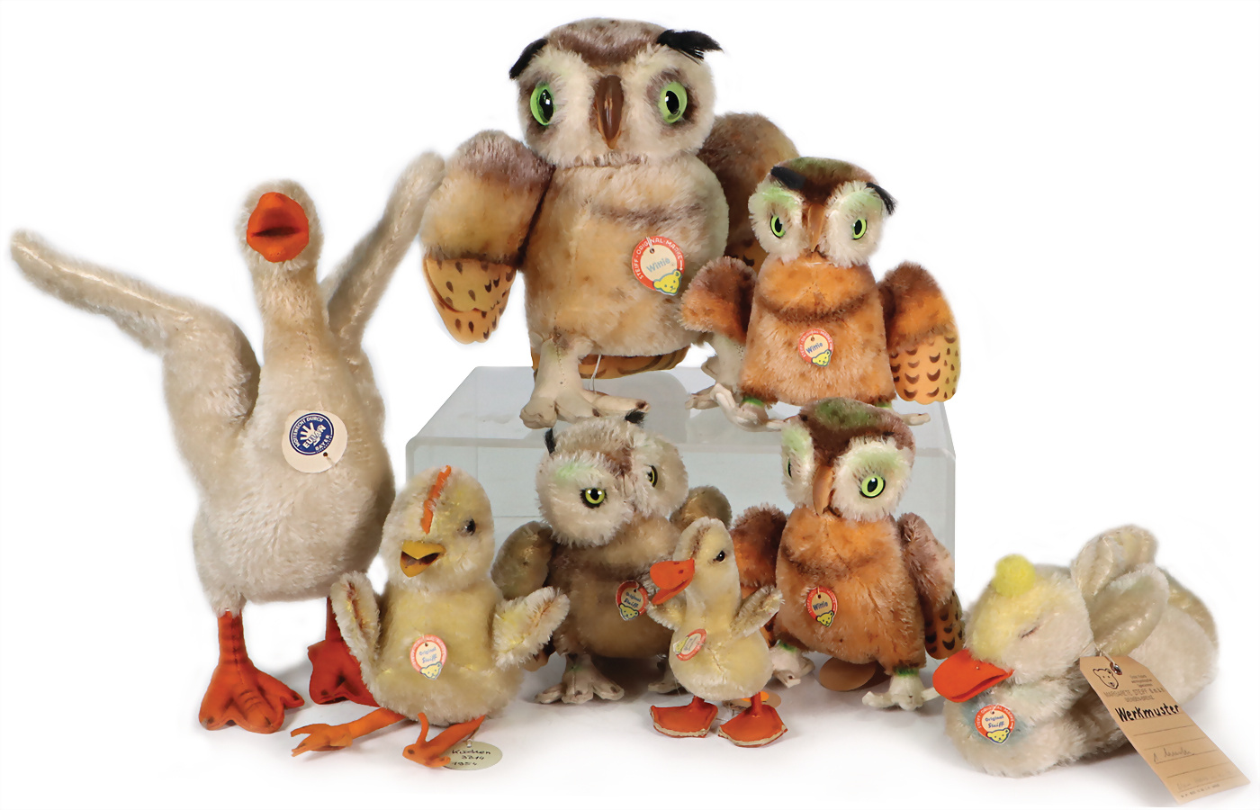 Konv. Nachkrieg, Uhu, komplett, Artikelnr. 4314, Archiv-Anhänger: 1954, mit Filz-Schnabel, WITTIE, mit Schild, Artikelnr. 2620/ 14, Archiv-Anhänger, 1968, Kunststoff-Schnabel, WITTIE, Artikelnr. 4322, mit Schild, Archiv-Anhänger: 1955, WITTIE, ohne Augenbrauen-Federn, mit Schild, Artikelnr. 2620/ 14, Archiv-Anhänger: 1968, Schlaf-Ente, Werkmuster, Gans, mit Schild, Artikelnr. 6828,00, Archiv-Anhänger: 1958, Küken, mit Schild, Artikelnr. 3314, Archiv-Anhänger: 1954, Ente mit Schild, Artikelnr. 6310, Archiv-Anhänger: 1952, sehr guter unbespielter Zust., Handmuster aus dem Steiff-Archiv mit orig. Steiff-Archiv Anhänger