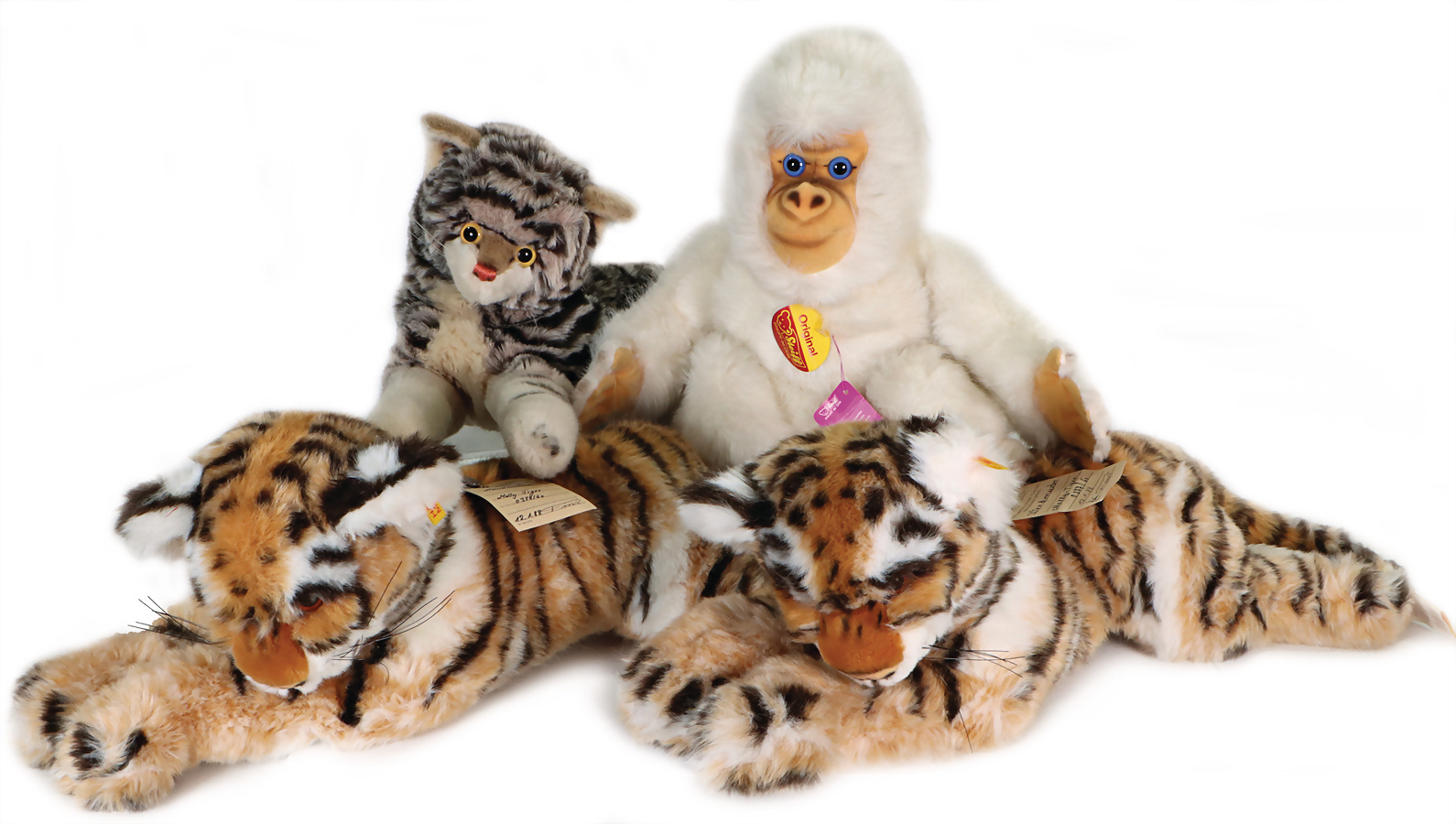 Konv. Nachkrieg, MOLLY-TIGER, Artikelnr. 0387/ 60, komplett, gelbe Fahne, Aufdruck: Werkmuster, Anhänger mit Siegel: Werkmuster, 1988, MOLLY-TIGER, komplett, Aufdruck auf Fahne: Handmuster, Anhänger mit Siegel: Handmuster, Artikelnr. 0378/ 60, 1988, MOLLY-KATZE, ohne Knopf und Schild, ohne Werksanhänger, Gorilla, Artikelnr. 0028/ 45, mit Schild, Archiv-Anhänger: 1979, neuw. unbespielter Zust., Handmuster aus dem Steiff-Archiv mit orig. Steiff-Archiv Anhänger