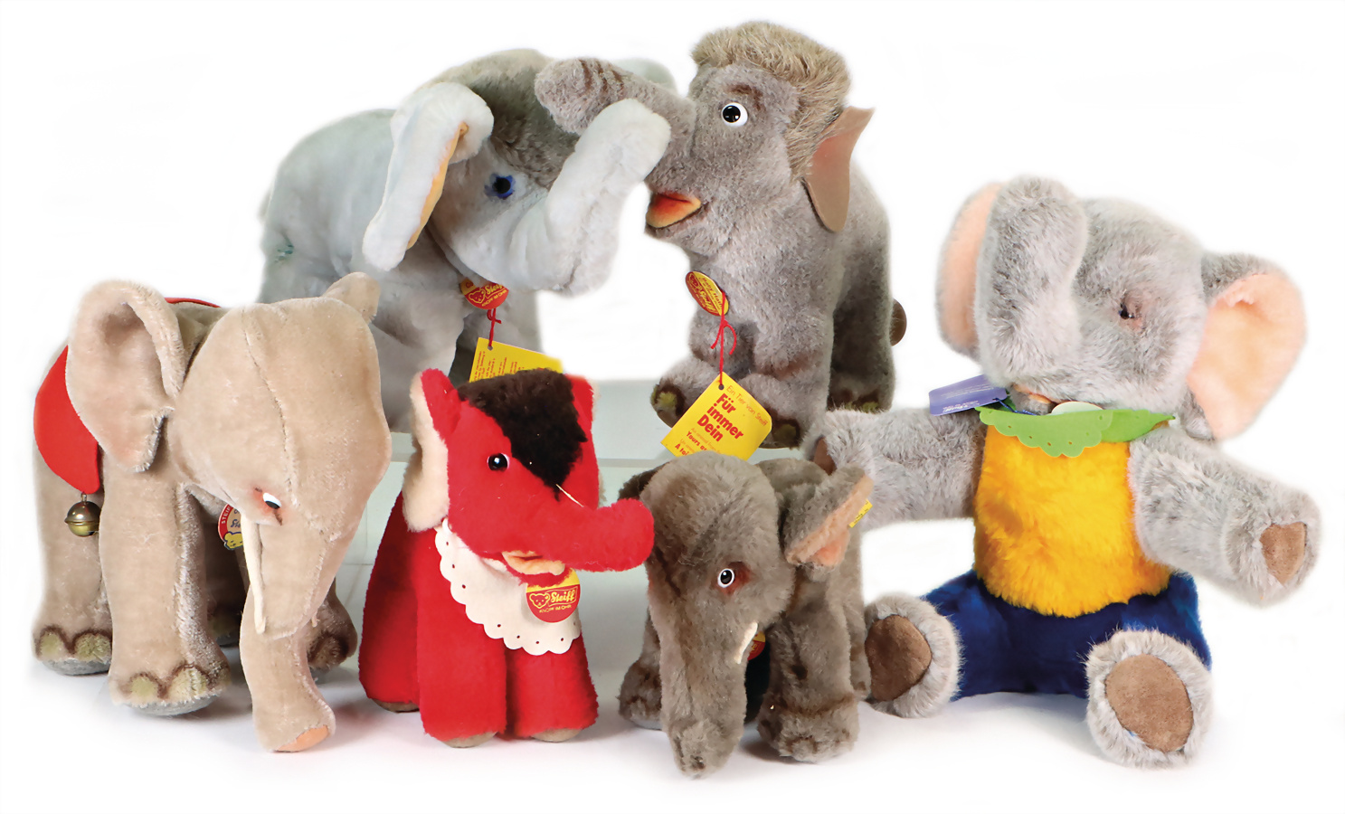 Konv. Nachkrieg, HATHI, mit Schild, Artikelnr. 0382/ 22, Archiv-Anhänger: 1979, DIGGI, mit Schild, Artikelnr. 6431/ 18, Archiv-Anhänger: 1973, Elefant, komplett, Artikelnr. 6322, 0, Archiv-Anhänger: 1952, HATHI-ELEFANT, mit Schild, Artikelnr. 6112/ 35, Archiv-Anhänger: 1975, COSY-TRAMPY, Artikelnr. 6352/ 25, mit Schild, Archiv-Anhänger: 1982, JACOBONBO, komplett, Artikelnr. 5810/ 15, Archiv-Anhänger: 1971, sehr guter unbespielter Zust., Handmuster aus dem Steiff-Archiv mit orig. Steiff-Archiv Anhänger