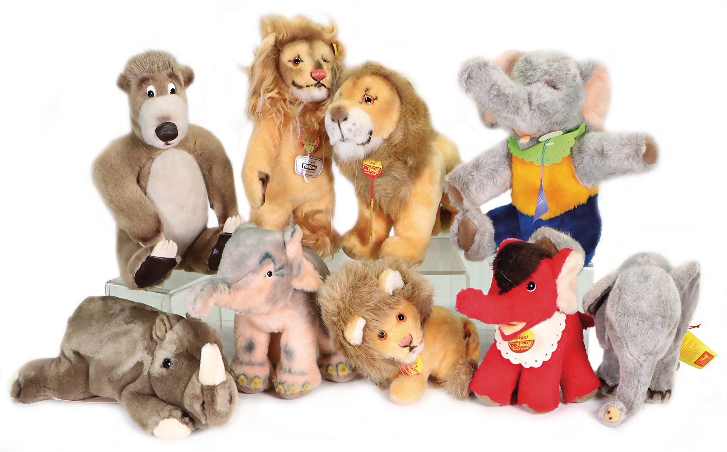 Konv. Nachkrieg, COSY-NOSY, komplett, rückseitig Aufdruck auf der Fahne: Werkmuster, Anhänger mit Siegel, Artikelnr. 5420/ 19, 1987, mit Archiv-Anhänger, Weichlöwe, mit Schild, Artikelnr. 6212/ 30, Archiv-Anhänger: 1971, SNUFFY, mit Schild, Artikelnr. 3518/ 18, Archiv-Anhänger: 1975, LEO, komplett, Artikelnr. 085/ 26, Archiv-Anhänger: 1975, HAPPY, mit Schild, Artikelnr. 6112/ 35, Archiv-Anhänger: 1975, COSY-TRAMPY, ohne Knopf und Schild, Artikelnr. 4880/ 20, Archiv-Anhänger: 1968, DIGGI, mit Schild, Artikelnr. 6431/ 18, Archiv-Anhänger: 1973, DIGGI, mit Schild, Artikelnr. 0505/ 18, Archiv-Anhänger: 1979, BALLO, ohne Knopf und Schild, Artikelnr. 0380/ 28, Archiv-Anhänger: 1980, sehr guter unbespielter Zust., Handmuster aus dem Steiff-Archiv mit orig. Steiff-Archiv Anhänger
