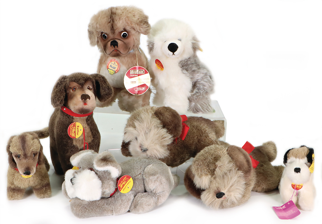 Konv. Nachkrieg, Hunde, FLOPPY, mit Schild, Artikelnr. 5717/ 20, Archiv-Anhänger: 1978, COSY-PEKINESE, Artikelnr. 5070/ 20, Archiv-Anhänger: 1968, FLOPPY-RAUDI, Artikelnr. 5712/ 20, Archiv-Anhänger: 1978, RATTLER, mit Schild, Artikelnr. 4020/ 20, Archiv-Anhänger: 1979, COSY-LUMPI, mit Knopf und Schild, Anhänger mit Siegel: Handmuster, Artikelnr. 5466/ 16, Archiv-Anhänger: 1984, BOZI, mit Schild, Artikelnr. 4144/ 12, Archiv-Anhänger: 1979, FOXY, komplett, mit Siegel Artikelnr. 1528/ 11, Archiv-Anhänger: 1977, MOBBY, komplett, Aufschrift auf Fahne: Handmuster, Anhänger mit Siegel: Handmuster Produktionsentwicklung, Artikelnr. 4132/ 20, Archiv-Anhänger: 1987, sehr guter unbespielter Zust., Handmuster aus dem Steiff-Archiv mit orig. Steiff-Archiv Anhänger
