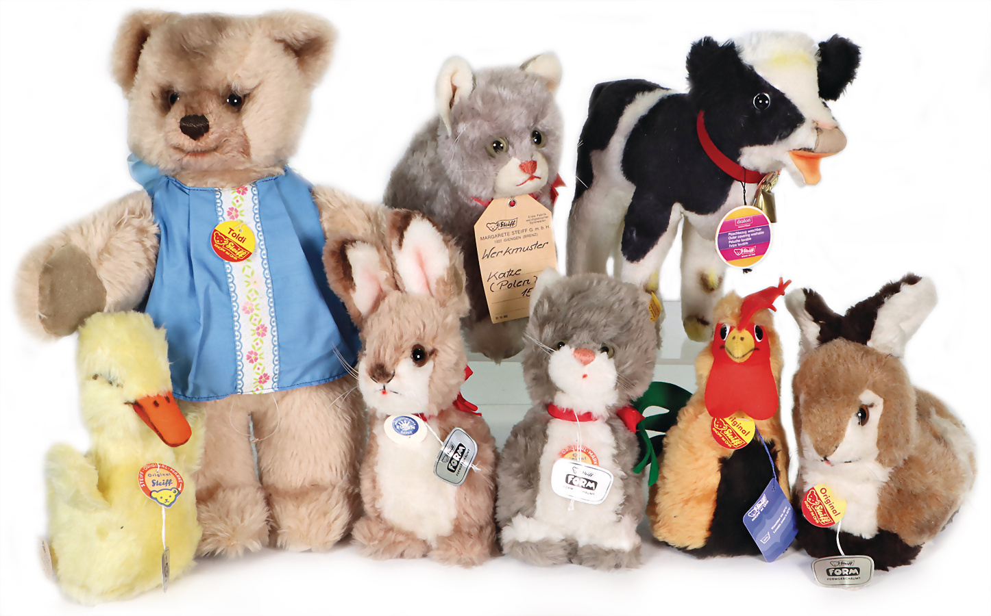 Konv. Nachkrieg, TOLDI, mit Schild, Artikelnr. 6200/ 40, Archiv-Anhänger: 1970, BUZZEL-ENTE, mit Schild, Artikelnr. 6175/ 20, Archiv-Anhänger: 1971, BUZZEL-HAHN, komplett, Artikelnr. 6158/ 20, Archiv-Anhänger: 1971, Katze, ohne Knopf und Schild, mit Anhänger: Werkmuster, 1970, COSY-KÄLBLE, Artikelnr. 5186/ 28, Archiv-Anhänger: 1970, Schafe, mit Schild, Artikelnr. 3165/ 22, Archiv-Anhänger: 1972, BUZZEL-HASE, mit Schild, Artikelnr. 6165/ 20, Archiv-Anhänger: 1971, BUZZEL-KATZE, komplett, Nr. auf Fahne handschriftlich: 6155/ 20, Archiv-Anhänger: 1971, sehr guter unbespielter Zust., Handmuster aus dem Steiff-Archiv mit orig. Steiff-Archiv Anhänger