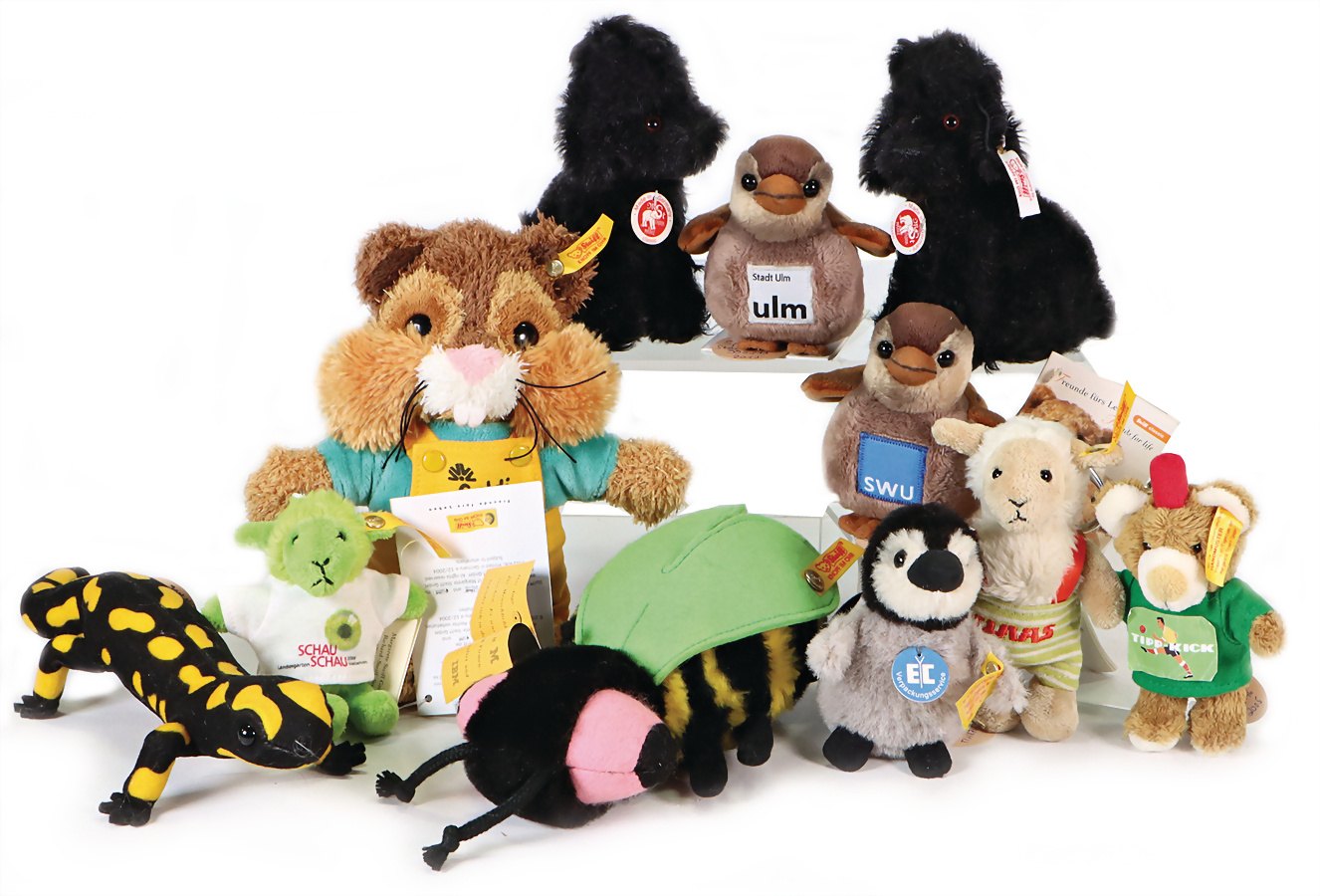 Konv. 10 Artikel, Spatz, SWU, Artikel-Nr. 990304, mit goldenem Knopf, gelbe Fahne, Aufschrift, Werkmuster, 9 cm, Salamander, Artikel-Nr. 488061, mit goldenem Knopf, weiße Fahne, Aufdruck Handmuster, 24 cm, Goldi Hamster, goldener Knopf, gelbe Fahne, mit Aufdruck Werkmuster, 18 cm, Teddy-Schlüsselanhänger, Tipp-Kick, Artikel-Nr. 993046, goldener Knopf, gelbe Fahne, Aufschrift Handmuster, 11 cm, Schlüsselanhänger, Lamm, Artikel-Nr. 993206, goldener Knopf, gelbe Fahne, Werkmuster, 9 cm, Schlüsselanhänger, Glas, Artikel-Nr. 993114, goldener Knopf, gelbe Fahne, Aufschrift, Handmuster, 12 cm, Baby-Pinguin, EDC Verpackungsservice, goldener Knopf, gelbe Fahne, 9 cm, Spatz, Stadt Ulm, Artikel-Nr. 990311, goldener Knopf, gelbe Fahne, Aufschrift Werkmuster, 9 cm, Max Dreger, Pudel, Artikel-Nr. 992650, goldener Knopf, weiße Fahne, Aufschrift Handmuster, 13 cm, Max Dreger, Pudel, 13 cm, Max Dreger, Pudel, Artikel-Nr. 992650, goldener Knopf, weiße Fahne, Aufschrift Werkmuster, 13 cm, IBM, Biene, Aritkel-Nr. 99741, goldener Knopf, gelbe Fahne, mit Aufschrift Werkmuster, 19 cm, Handmuster aus dem STEIFF Archiv, mit orig. STEIFF Archiv-Anhänger