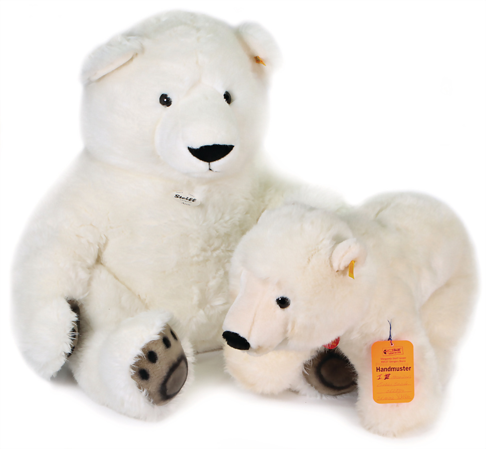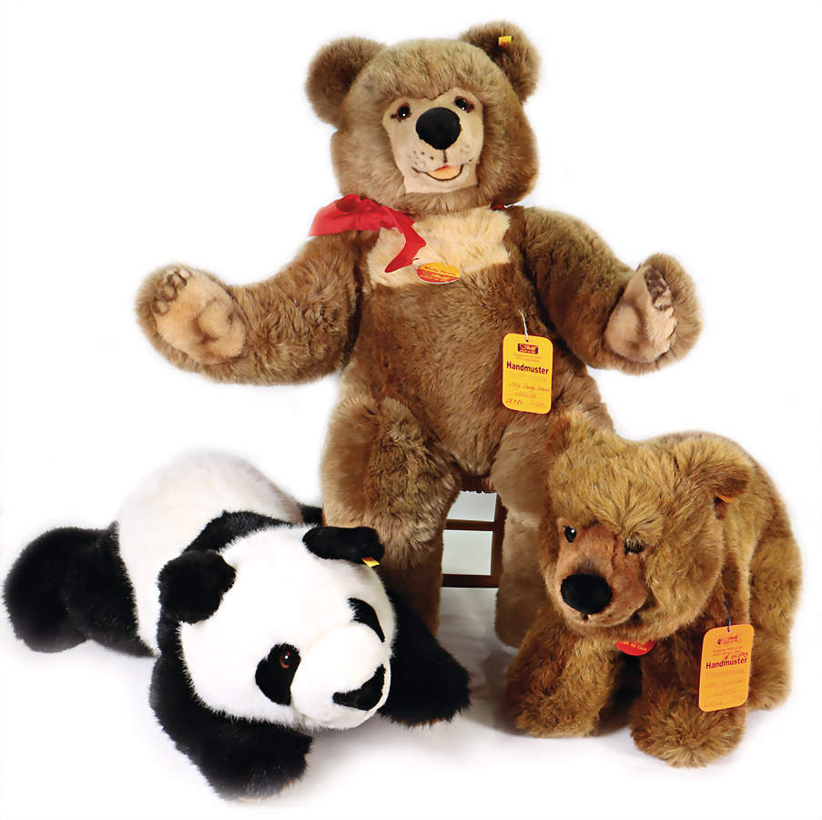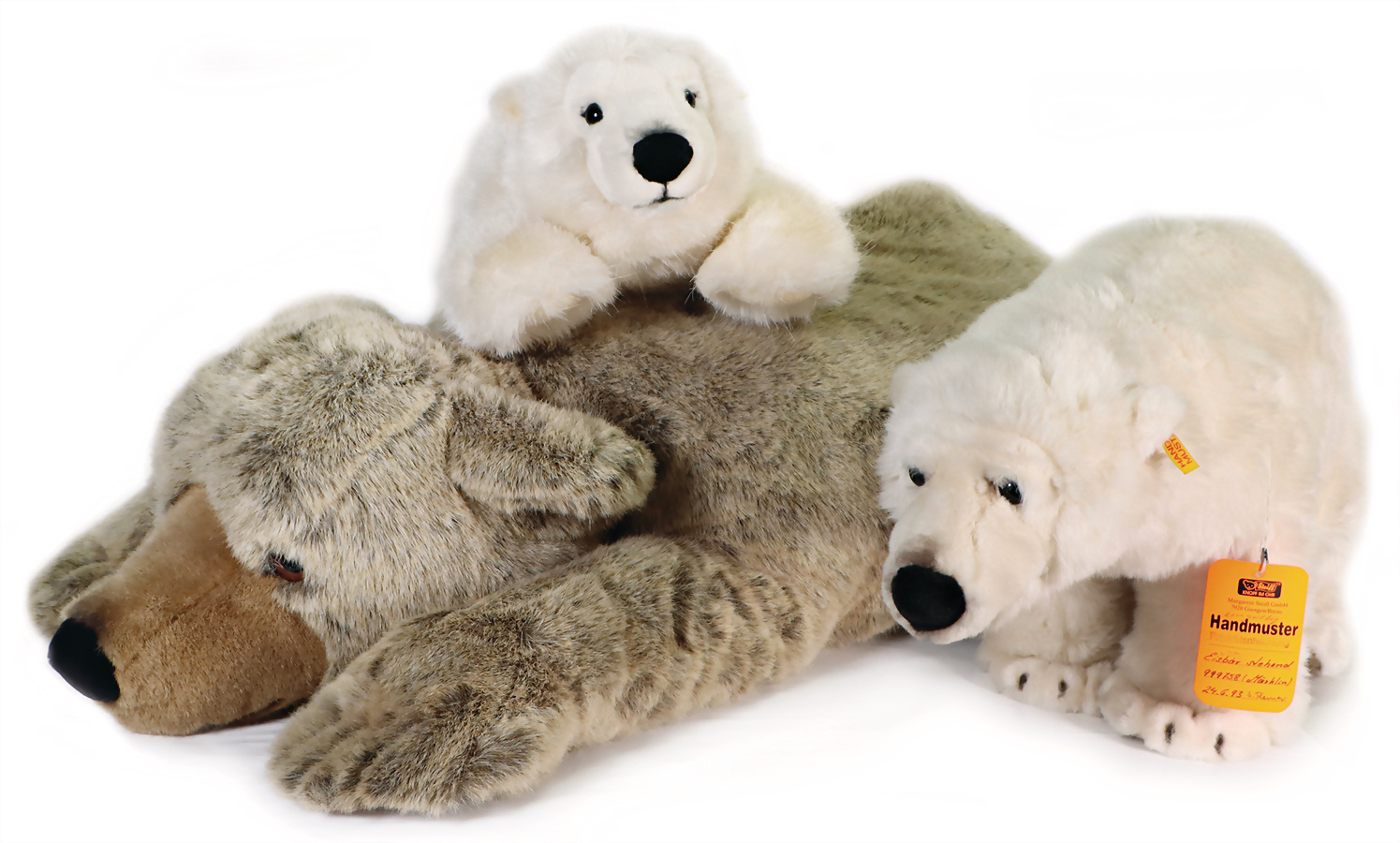 Urs, Braunbär, Artikel-Nr. 069864, goldener Knopf, gelbe Fahne, Aufdruck Handmuster, Archiv-Anhänger, 1993, L: 110 cm, guter Zust., Eisbär, stehend, goldener Knopf, gelbe Fahne, Aufdruck Handmuster, mit Anhänger Handmuster, 1993, Artikel-Nr. 999758, mit Metallsiegel, sehr guter Zust., L: 55 cm, H: 32 cm, Eisbär, liegend, Artikel-Nr. 062919, kompl., goldener Knopf, gelbe Fahne, Aufdruck Handmuster, Archiv-Anhänger, 1999, L: 55 cm, guter Zust., Handmuster aus dem STEIFF Archiv, mit orig. STEIFF Archiv-Anhänger