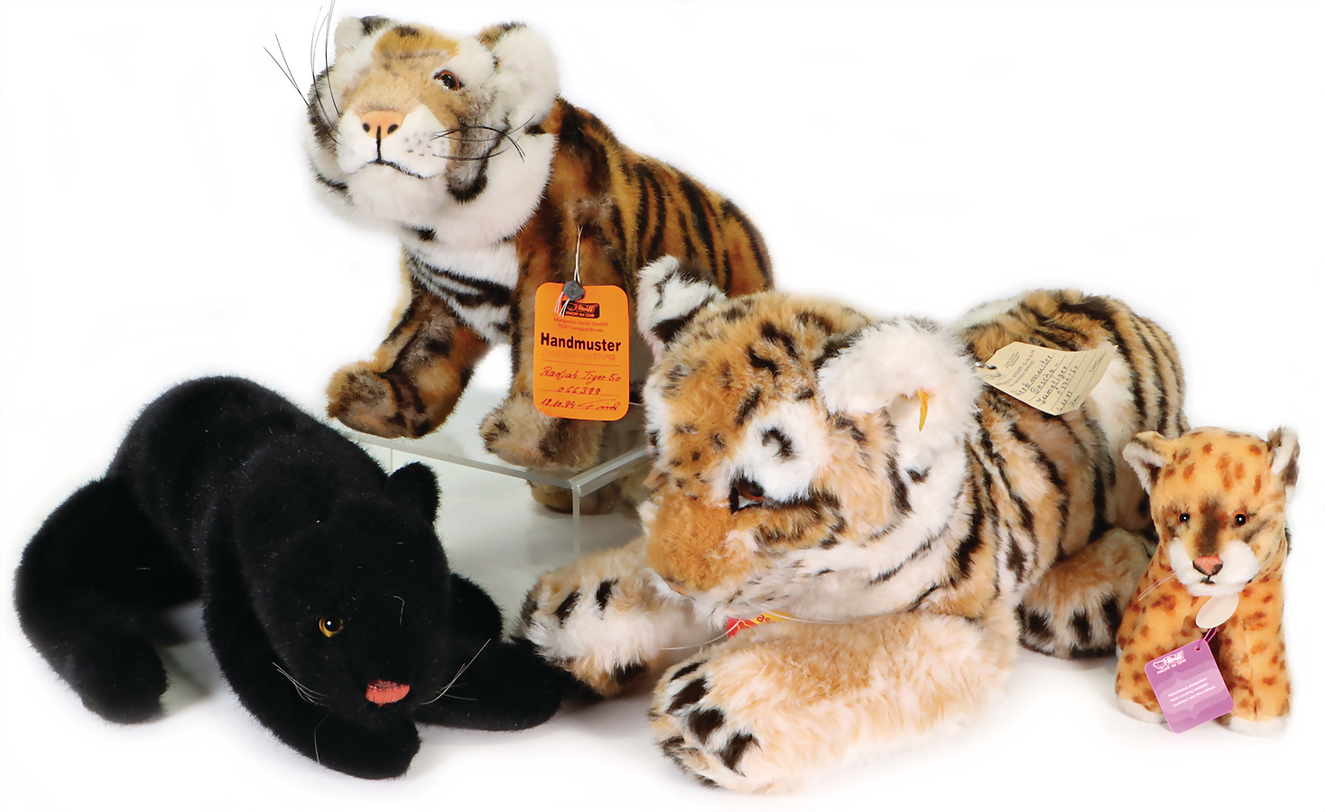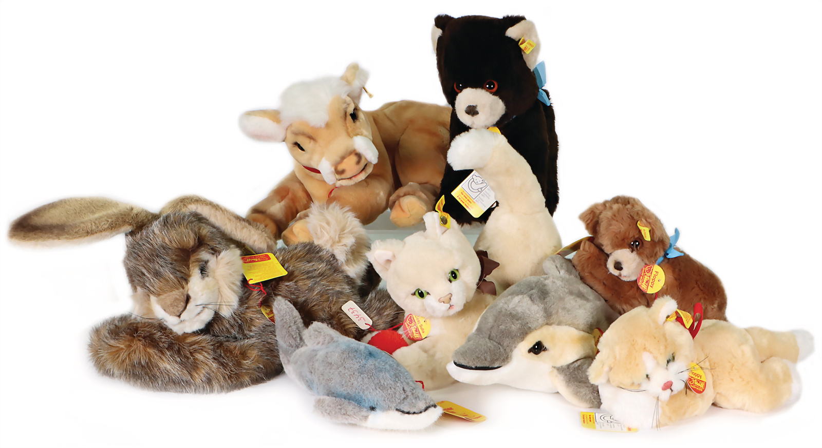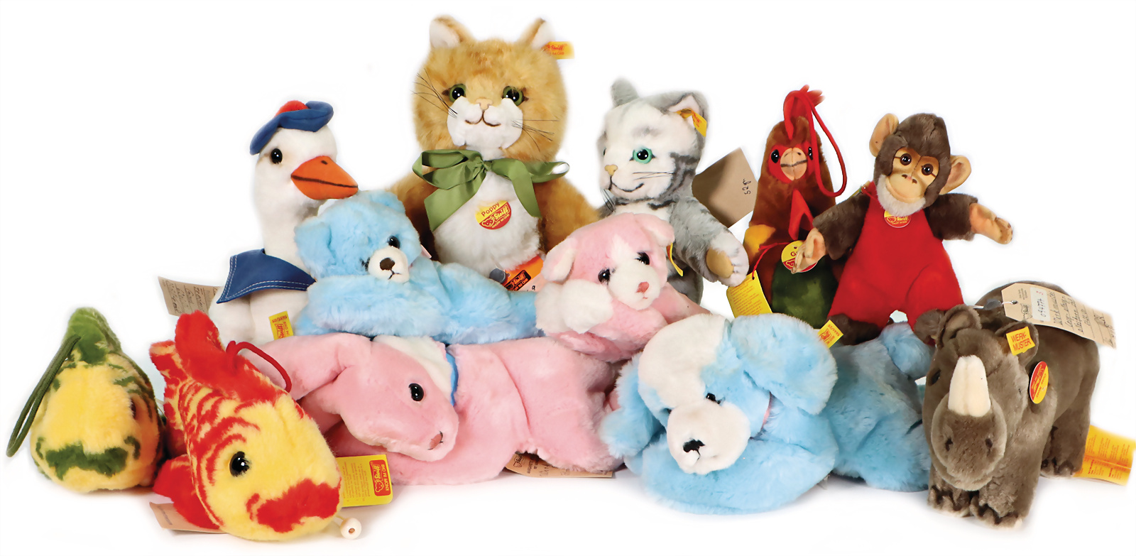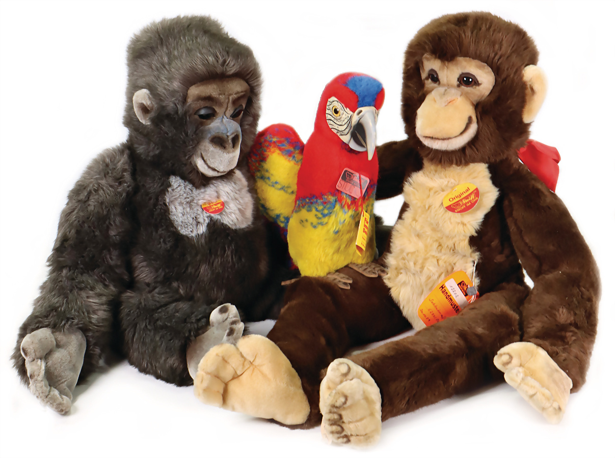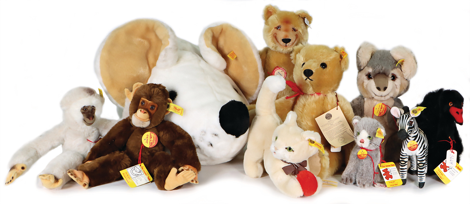 Konv. 10 Art., Affe, gelbe Fahne, goldener Knopf, Nr.0040-28, Anhänger mit Geschmacksmusteranmeldung beim Amtsgericht, Nr.2939, 10cm, Susi kompl. mit Knopf, Schild und gelber Fahne, Nr.1493-13, Anhänger mit Geschmacksmusteranmeldung beim Amtsgericht Nr. 3085, 13 cm, Cosi Koala kompl. mit Brustschild, Knopf und gelbem Anhänger mit Geschmacksmusteranmeldung beim Amtsgericht, mit Knopf und gelber Fahne, Nr.0166-35, Anhänger mit Geschmacksmusteranmeldung beim Amtsgericht, Nr.3721, 35cm, Affe Yoko kompl., braun, Anhänger mit Geschmacksmusteranmeldung beim Amtsgericht, Nr.3079, 25 cm, Zebra Ossi kompl., Anhänger mit Geschmacksmusteranmeldung Nr.3087, 16 cm, Dicky Replika kompl., Anhänger mit Geschmacksmusteranmeldung beim Amtsgericht Nr.3405, 33cm, Schwan mit Knopf + gelber Fahne, 2613-20, Anhänger mit Geschmacksmusteranmeldung beim Amtsgericht, Nr.3224,17 cm, Katze mit Ball kompl.,Cosi Sula mit Anhänger Geschmacksmusteranmeldung beim Amtsgericht Nummer 3436, 21 cm, Maus kompl., Anhänger mit Geschmacksmusteranmeldung beim Amtsgericht Nr.3653, 46 cm.