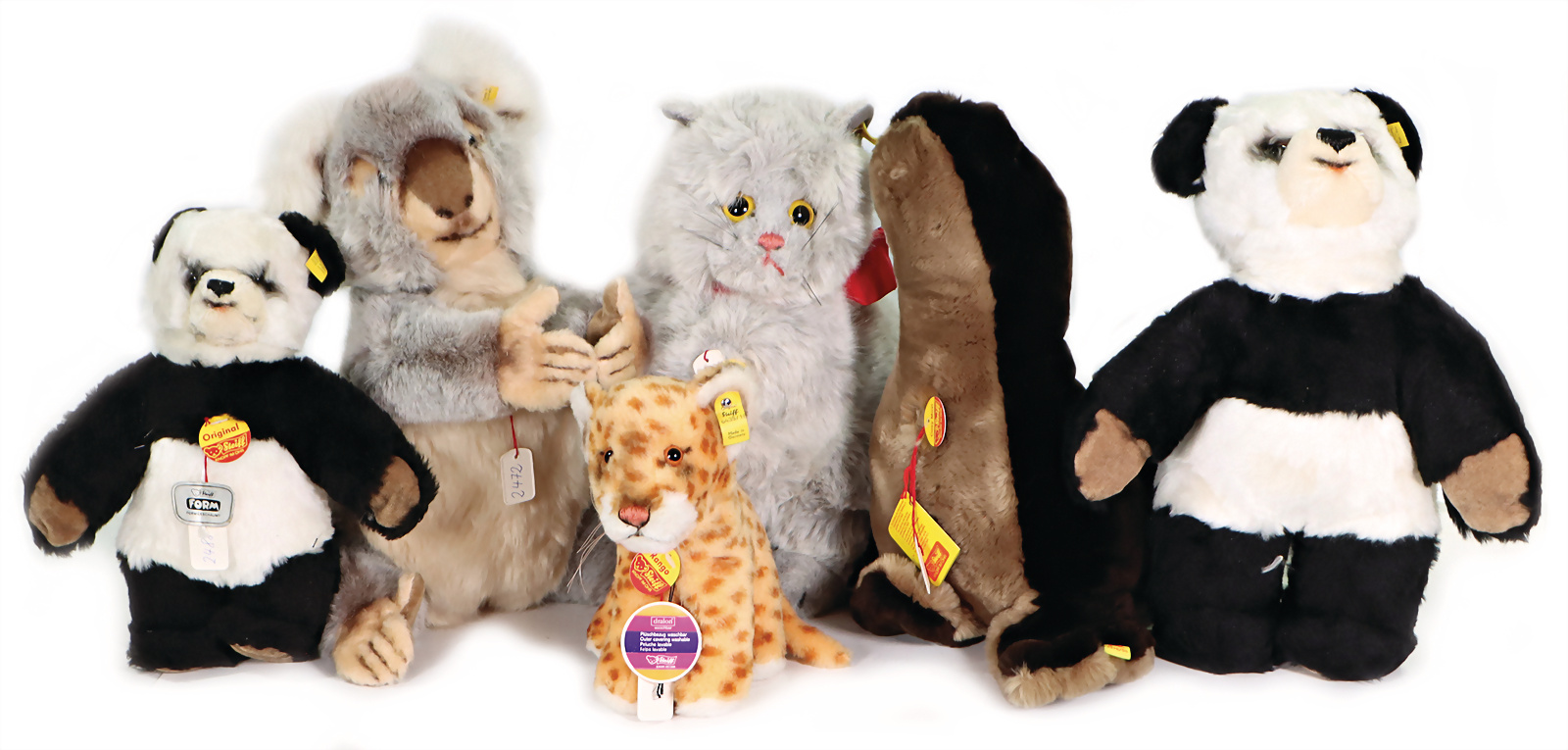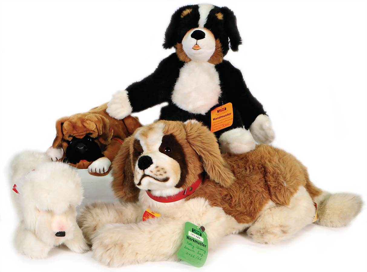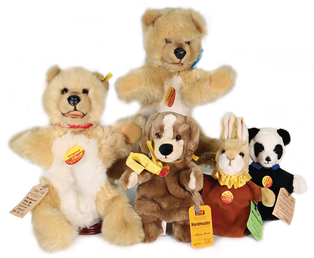 Konv. 5 Art., Mimik-Bär, mit Brustschild, Art.-Nr. 3490/45, mit Archiv-Anhänger, 1983, 40 cm, sehr guter Zust., Jolly-Bär, Artikel-Nr. 3490/45, mit Brustschild, goldenem Knopf u. gelber Fahne, Handmuster aus dem STEIFF Archiv, mit orig. STEIFF Archiv-Anhänger u. Metall-Siegel, 43 cm, sehr guter Zust., Happy Hund, Art.-Nr. 253638, mit Brustschild, goldenem Knopf, u. gelber Fahne, mit Aufdruck Handmuster, mit Handmuster-Schild u. Metall-Siegel, 30 cm, sehr guter Zust., Handspielpuppe Panda, Artikel-Nr. 6454/27, mit Brustschild, Werkmuster-Schild u. Metall-Siegel, 30 cm, sehr guter Zust., Handspielpuppe Hase, Artikel-Nr. 6482/28, mit Brustschild, goldenem Knopf u. gelber Fahne, mit Aufdruck Werkmuster, Werkmuster-Schild u. Metall-Siegel, 35 cm, sehr guter Zust., Handmuster aus dem STEIFF Archiv, mit Archiv-Anhänger