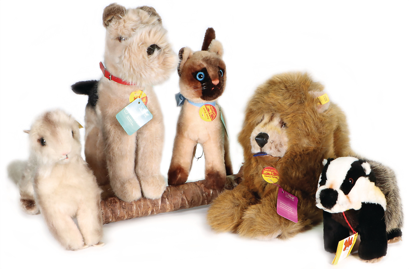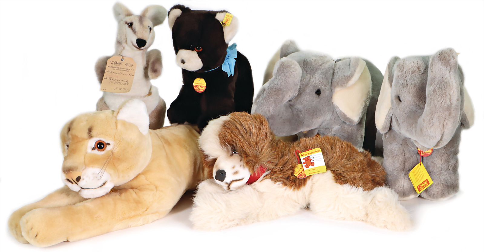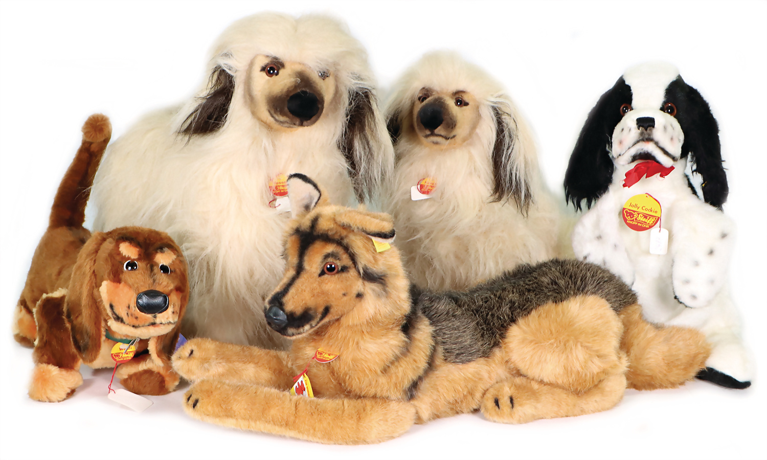 Konv. 5 Art., Mimik-Bär, mit Brustschild, Art.-Nr. 3490/45, mit Archiv-Anhänger, 1983, 40 cm, sehr guter Zust., Jolly-Bär, Artikel-Nr. 3490/45, mit Brustschild, goldenem Knopf u. gelber Fahne, Handmuster aus dem STEIFF Archiv, mit orig. STEIFF Archiv-Anhänger u. Metall-Siegel, 43 cm, sehr guter Zust., Happy Hund, Art.-Nr. 253638, mit Brustschild, goldenem Knopf, u. gelber Fahne, mit Aufdruck Handmuster, mit Handmuster-Schild u. Metall-Siegel, 30 cm, sehr guter Zust., Handspielpuppe Panda, Artikel-Nr. 6454/27, mit Brustschild, Werkmuster-Schild u. Metall-Siegel, 30 cm, sehr guter Zust., Handspielpuppe Hase, Artikel-Nr. 6482/28, mit Brustschild, goldenem Knopf u. gelber Fahne, mit Aufdruck Werkmuster, Werkmuster-Schild u. Metall-Siegel, 35 cm, sehr guter Zust., Handmuster aus dem STEIFF Archiv, mit Archiv-Anhänger