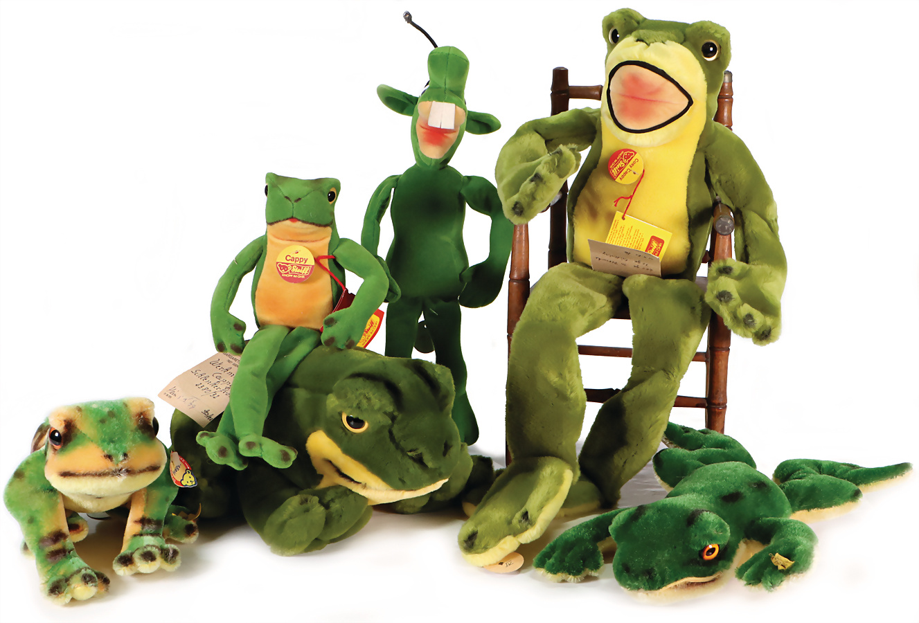 Konv. FROGGY, komplett, Artikelnr. 2380/22, Archiv-Anhänger: 1962, Frosch, mit Knopf, Fahne verschlissen, Artikelnr. 2322,00, Archiv-Anhänger: 1962, CAPPY, mit Schild, Archiv-Anhänger mit Siegel: Werkmuster, Schlenker-Frosch, Artikelnr. 2380/32, Archiv-Anhänger: 1979, COSY CAPPY, mit Schild, Werksanhänger mit Siegel: 5383/60, Archiv-Anhänger: 1981, COSY FROGGY, ohne Knopf und Schild, Artikelnr. 5384/28, Archiv-Anhänger: 1985, grünes Männchen vom Mars, ohne Knopf und Schild, Artikelnr. 7885/35, Archiv-Anhänger: 1982, sehr guter unbespielter Zust.