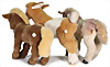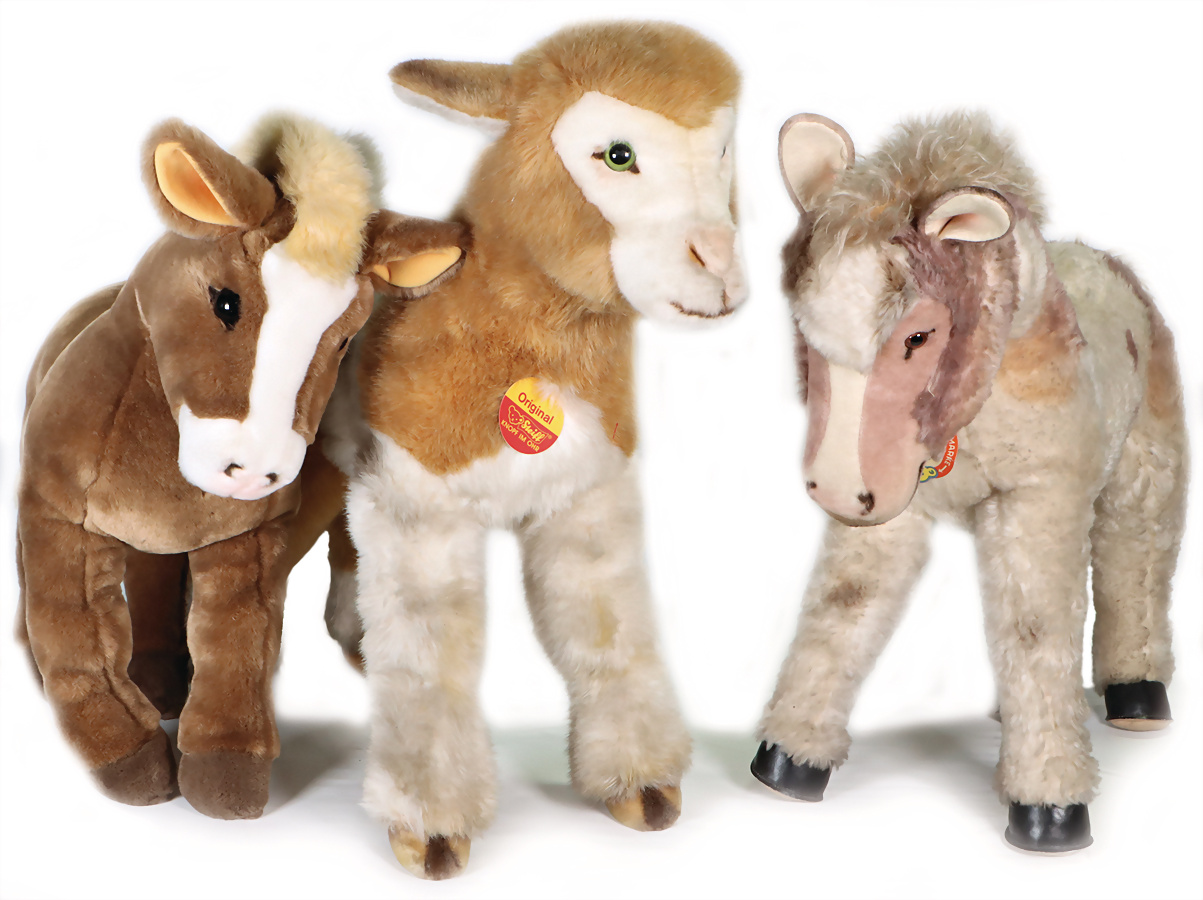 3 Teile, Pony, mit Schild, Schild geknickt, Artikelnr. 1650,00, Archiv-Anhänger: 1960, Zieglein, komplett, rote Fahne, Aufdruck: Werkmuster, Artikelnr. 0445/60, Archiv-Anhänger: 1989, Pferd, braun, 50 cm, ohne Knopf und Schild, Artikelnr. 523434, Archiv-Anhänger: 1993, älteres Pferd etwas verschmutzt, sonst sehr guter unbespielter Zust.