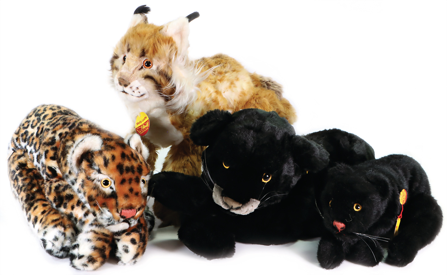 Konv. 6 Art., Mollie Puma kompl., Artikelnummer 0385-75, mit Anhänger, Werkmuster mit Metallsiegel, Länge 70 cm, Lupa Molli Berni, Artikelnummer 0342-40, mit Anhänger Werkmuster mit Metallsiegel, 38 cm, mit Schild, 2x Kosi Jumbo Grau, Artikelnummer 5350-30, mit Anhänger Werkmuster mit Metallsiegel, 40cm, Känguru, Artikelnummer 0710-35 mit Anhänger Handmuster 33 cm, Cosy Lomy mit Knopf Schild und gelber Fahne, Nr.5354/25 mit orig. Steiff Archivanhänger