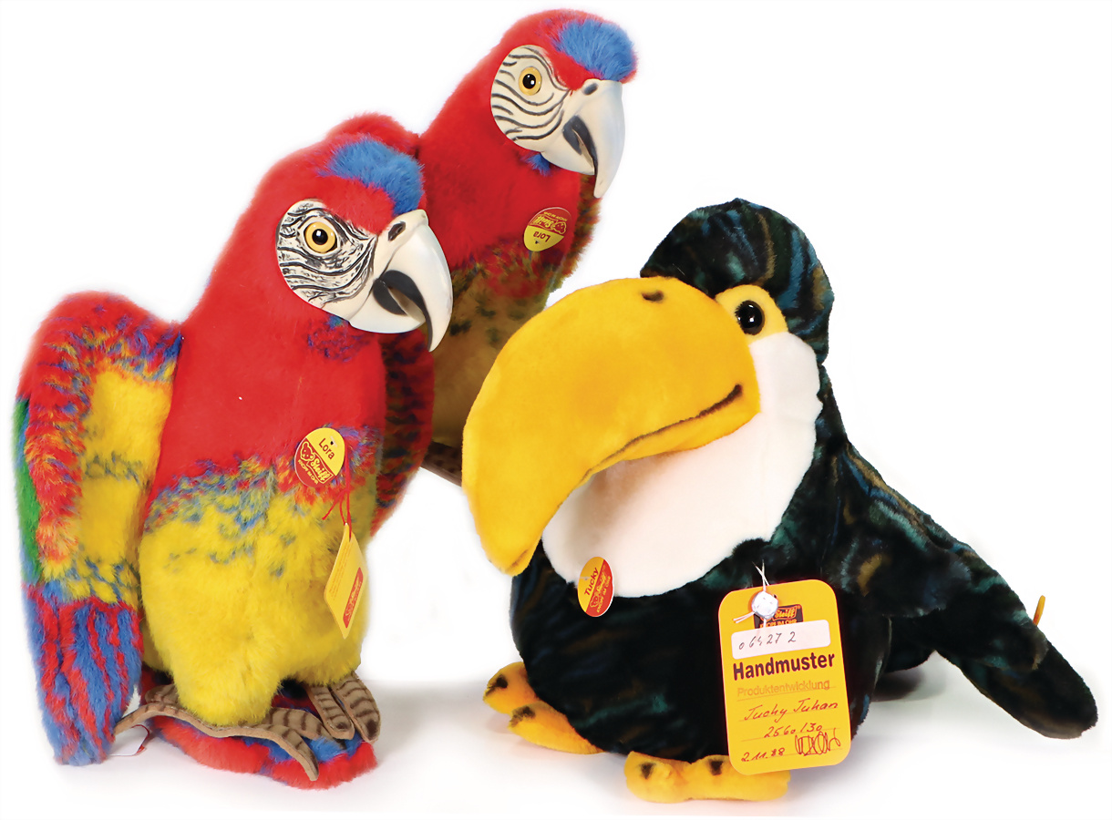 3 Teile, TUCKY TUKAN, komplett, gelbe Fahne, Aufdruck: Handmuster, Artikelnr. 2560/30, Archiv-Anhänger mit Siegel: Handmuster Produktentwicklung 1988, LORA, mit Schild, intensive Gesichtsbemalung, Artikelnr. 2540/30, Archiv-Anhänger: 1981, LORA, komplett, Artikelnr. 2540/30, Archiv-Anhänger: 1981, sehr guter unbespielter Zust.