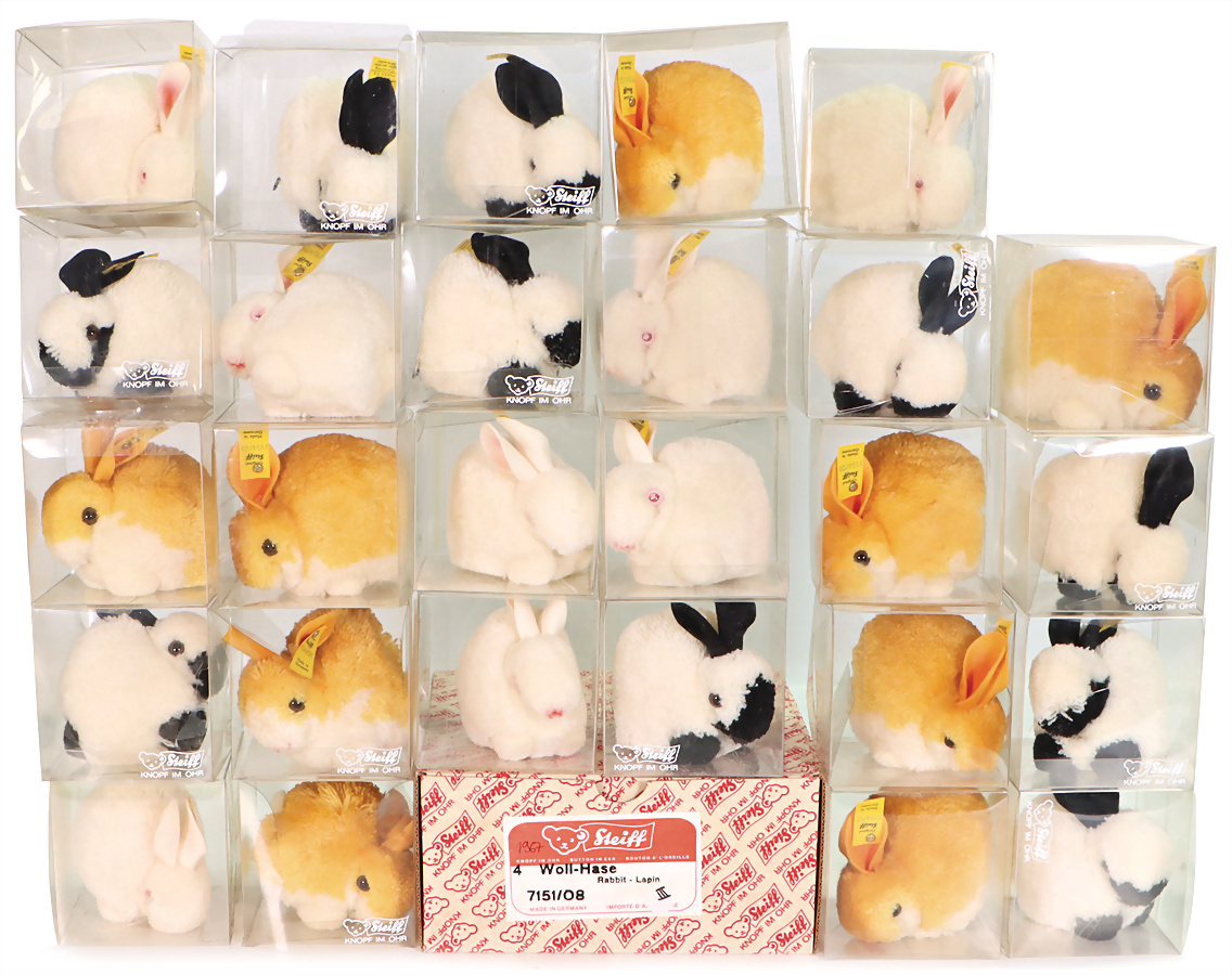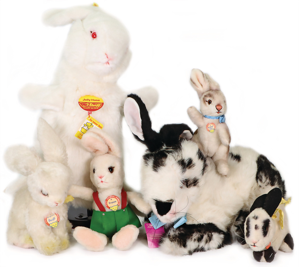 Konv. Hasen, SPOTTY, komplett, Artikelnr. 2970/30, Archiv-Anhänger: 1977, MOLLY-Hase, komplett, Archiv-Anhänger mit Siegel: Handmuster 3480/81, ZAPPY, mit Schild, Artikelnr. 8625,00, Archiv-Anhänger: 1966, COSY-Hase, mit Schild, Artikelnr. 4940/22, Archiv-Anhänger: 1968, TIMMY-Hase, mit Schild, Artikelnr. 3015/15, Archiv-Anhänger: 1968, DRALON-Hase, mit Schild, Artikelnr. 4617,00, Archiv-Anhänger: 1965, sehr guter unbespielter Zust., 1 Hase etwas verschmutzt durch Lagerung