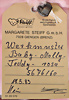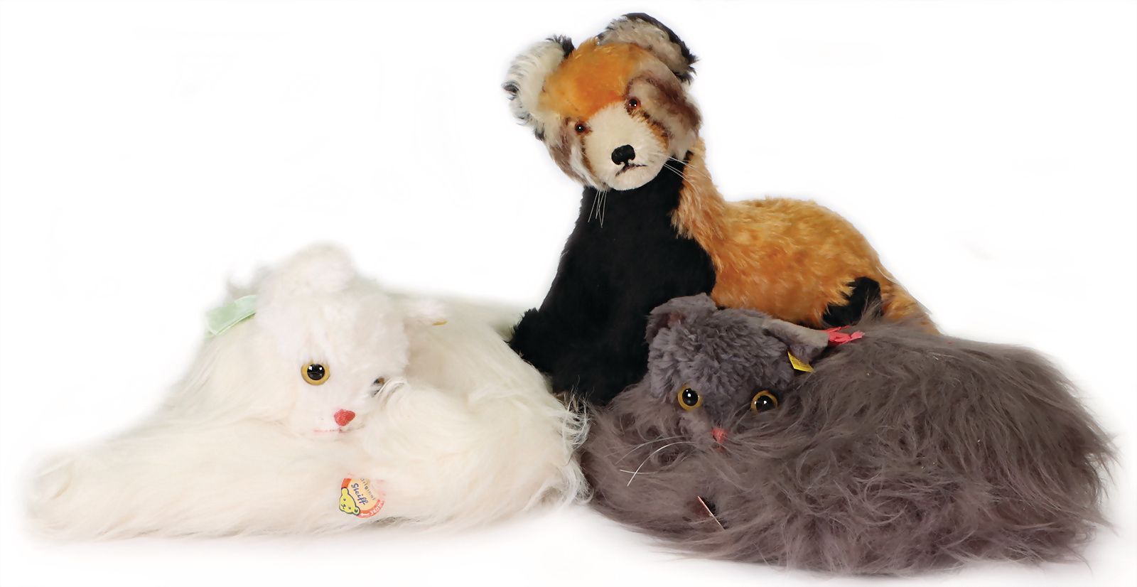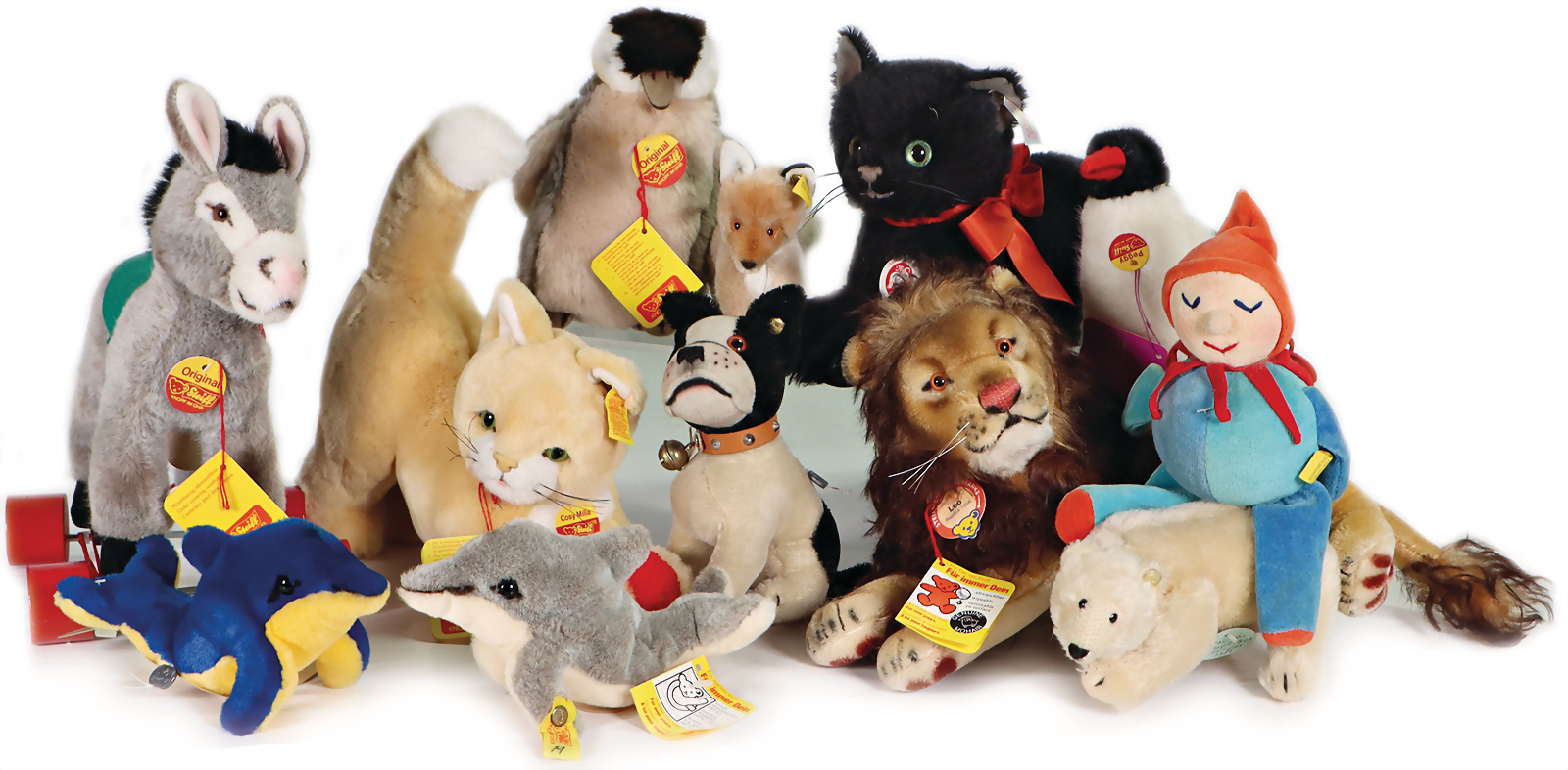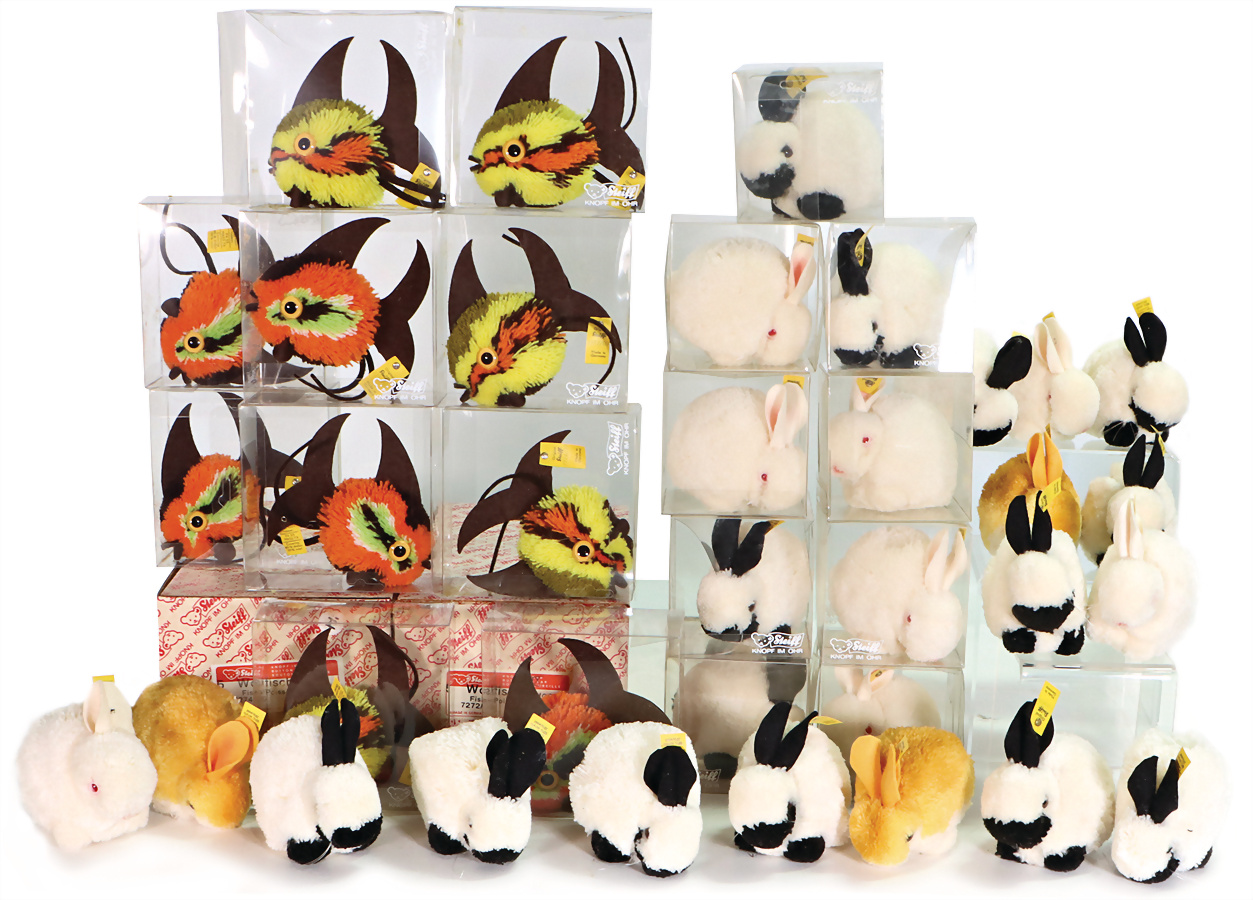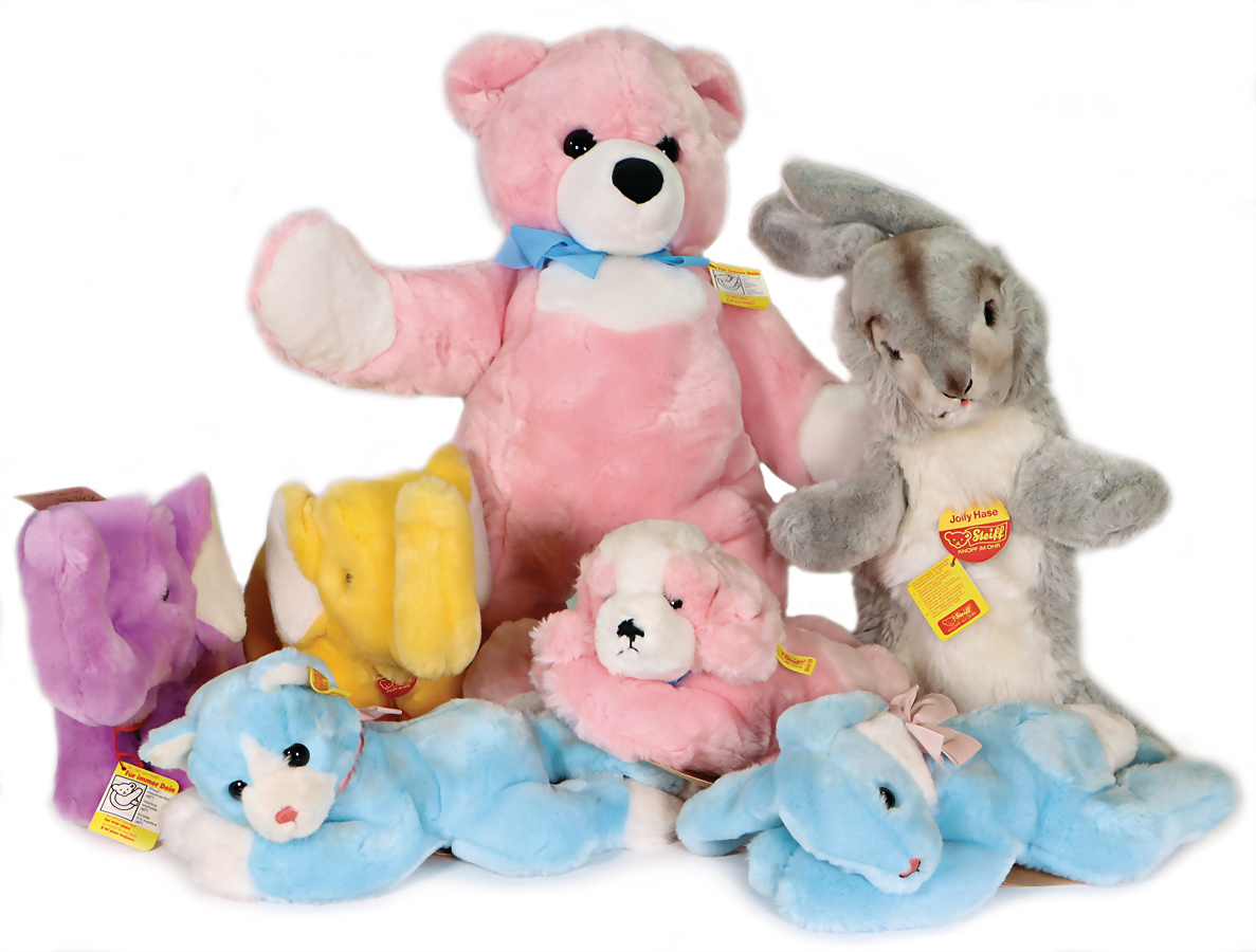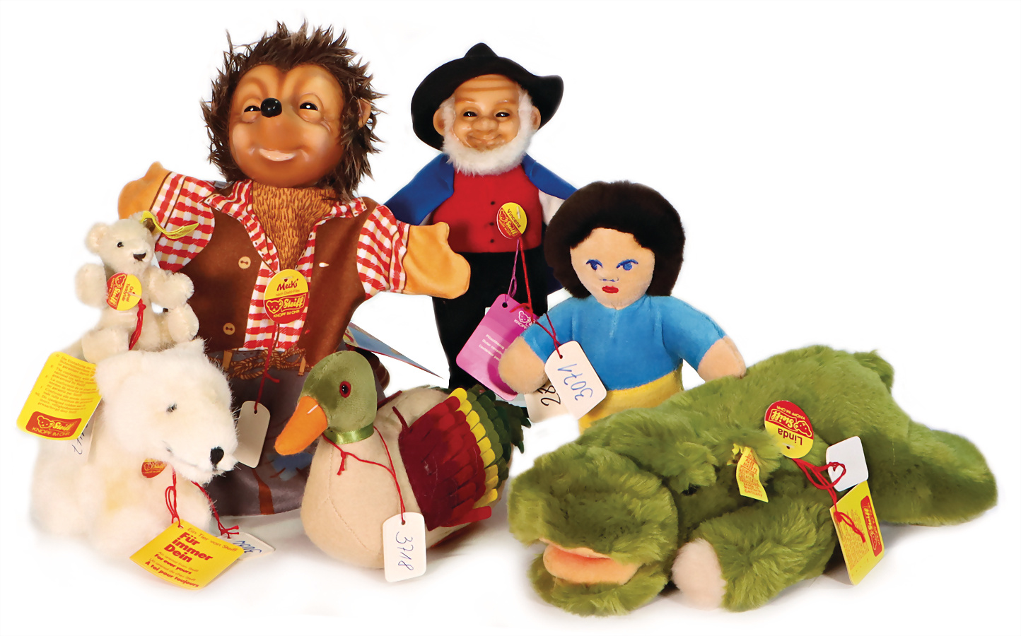 Konv. 7 Art., Linda kompl. mit Knopf, Schild u. gelber Fahne, mit Anhänger „Für immer Dein“, Geschmacksmusteranmeldung beim Amtsgericht, Nr. 3181, 27 cm, Vincenz kompl. mit Knopf, Schild u. gelber Fahne, Geschmacksmusteranmeldung beim Amtsgericht, Nr. 2854, 20 cm, Mecky, nach Diehl-Film, kompl. mit Knopf, Schild u. gelber Fahne, Geschmacksmusteranmeldung beim Amtsgericht, Nr. 3454, 26 cm, Stoffpuppe, gelbe Fahne, Geschmacksmusteranmeldung beim Amtsgericht, Nr. 3071, 18 cm, Eisbär Starly kompl. mit Knopf, Schild u. gelber Fahne, mit Anhänger „Ein Tier von STEIFF für immer Dein“, Geschmacksmusteranmeldung beim Amtsgericht, Nr. 3032, 17 cm, Teddy-Bär, kompl. mit Knopf, Schild u. gelber Fahne, Geschmacksmusteranmeldung beim Amtsgericht, Nr. 3147, 8 cm, Ente, mit goldenem Knopf, Geschmacksmusteranmeldung beim Amtsgericht, Nr. 3718, 18 cm