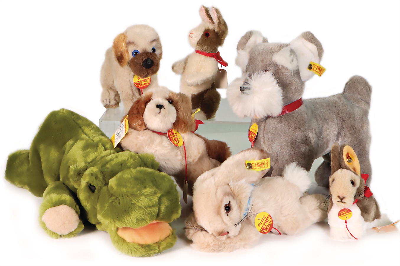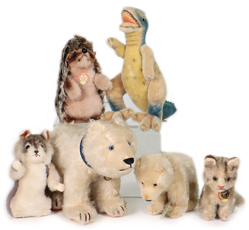 Konv. Tyrannosaurus, ohne Knopf und Schild, Artikelnr. 4317,90, Archiv-Anhänger: 1958, Chinchilla, ohne Knopf und Schild, Artikelnr. 4815, Archiv-Anhänger: 1965, Eisbär, ohne Knopf und Schild, Artikelnr. 0460/12, Archiv-Anhänger: 1967, DOGGI, mit Schild, Artikelnr. 1680/12, Archiv-Anhänger: 1978, SUSI, mit Schild, Artikelnr. 3310,00, Archiv-Anhänger: 1960, Eisbär, mit Knopf, ohne Schild, mit US-Fahne, Artikelnr. 0460/16, Archiv-Anhänger: falsches Datum auf Anhänger, auf Bauch beschriftet: Muster