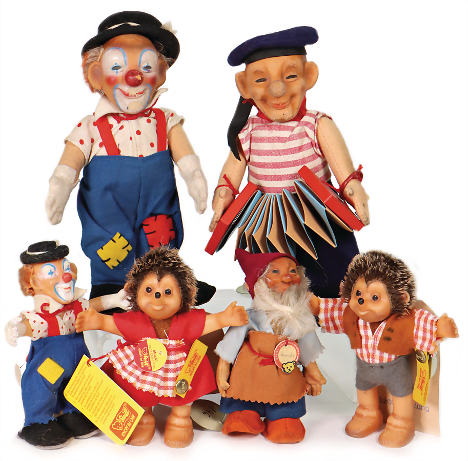 Konv. GUCKI, mit Schild, Gummi Verfärbungen, kl. Einriss Stellen, Artikelnr. 718.1, Archiv-Anhänger: 1973, Matrose, ohne Knopf und Schild, Artikelnr. 718, Archiv-Anhänger: 1954, MECKI, Knopf und Fahne, Aufdruck: Werkmuster, Artikelnr. 7627/12, Archiv-Anhänger mit Siegel: 1986, NIKI, komplett, gelbe Fahne, Aufdruck: Werkmuster, Werkmuster-Anhänger mit Siegel: 7628/12 1986, BROWNIE, ohne Knopf und Schild, Artikelnr. 719, Archiv-Anhänger: 1954, CLOWNIE, ohne Knopf und Schild, Artikelnr. 8714,00, Archiv-Anhänger: 1965, sehr guter unbespielter Zust.,