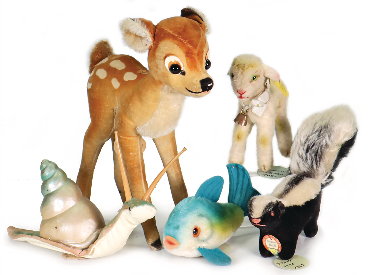 Konv. 5 Artikel, Schnecke, Nelly, mit Archiv-Anhänger, 1961, Artikel-Nr. 2410,09, 16 cm, guter Zust., Fisch, Artikel-Nr. 2310,00, mit Archiv-Anhänger, 1960, 12 cm, guter Zust., Lamm, Artikel-Nr. 6510,0, mit Archiv-Anhänger, 1952, mit Knopf u. gelber Fahne, 12 cm, Bambi, Artikel-Nr. 1840/22, mit Archiv-Anhänger, 1967, mit silbernem Knopf u. gelber Fahne, leicht verschmutzt, Naht am Rücken etw. nachgebessert, 22 cm, Skunk, Artikel-Nr. 1410, mit Archiv-Anhänger, 1962, mit Brustschild, 20 cm, guter Zust., Handmuster aus dem STEIFF Archiv, mit orig. STEIFF Archiv-Anhänger