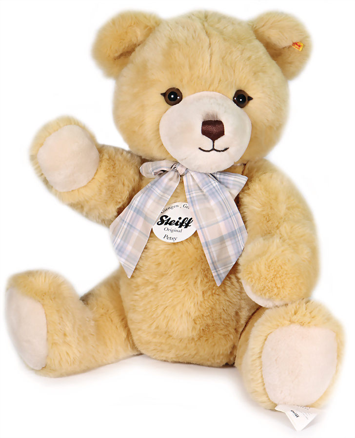 Original Petsy, komplett, goldener Knopf, gelbe Fahne, ohne Nr., rückseitig Werkmuster-Aufdruck, 80 cm, sehr guter unbespielter Zustand, , mit Werkmusterlager-Anhänger Aufschrift Petsy 012037 von 2014, eingeliefert aus dem STEIFF Archiv