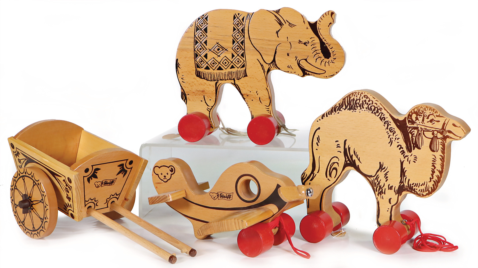 Holzspielzeug, Elefant, Artikel-Nr. 8350/20, 1968, mit Metallschild, Handwagen, Archiv-Anhänger 8320/12, 1969, Dromedar, Archiv-Anhänger, 8350/21, 1969, Flugzeug, Archiv-Anhänger 0430/12, 1969, sehr guter unbespielter Zustand, Handmuster aus dem STEIFF Archiv