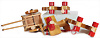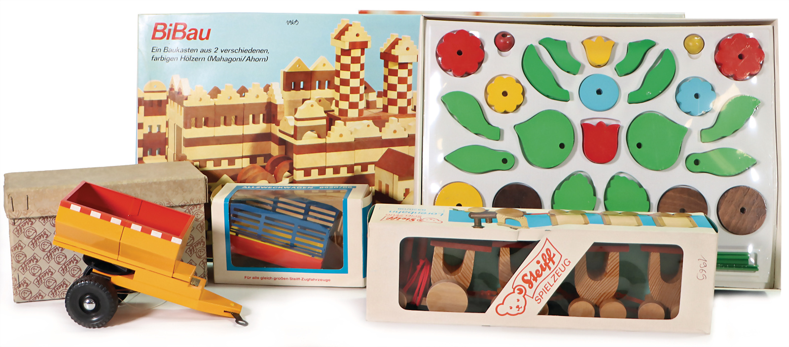 Konv. Holzspielzeug, Blumenbaukasten, 1969, Bibau, Baukasten für verschiedenfarbige Holzhäuser, 1969, Eisenbahn, Artikel-Nr. 8420/08, 1969, Streuwagen, Artikel-Nr. 8808/12, Archiv-Anhänger, 1969, im original Karton, Allzweckwagen, 8920/06, sehr guter, unbespielter Zustand, Handmuster aus dem STEIFF Archiv
