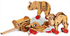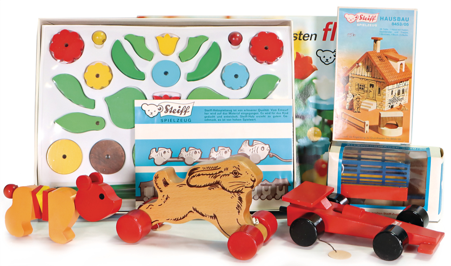 Konv. Holzspielzeug, Rennwagen, Archiv-Anhänger, Nr. 9720/20, 1973, Allzweckwagen, Artikel-Nr. 8920/06, im original Karton, kleiner Bär, Archiv-Anhänger, 8330/09, 1972, Holzhase, Archiv-Anhänger, 8360/12, 1969, Hausbau, 8453/05, 1970, im original Karton, Blumenbaukasten, Flora, 1969, im original Karton, sehr guter unbespielter Zustand, Handmuster aus dem STEIFF Archiv