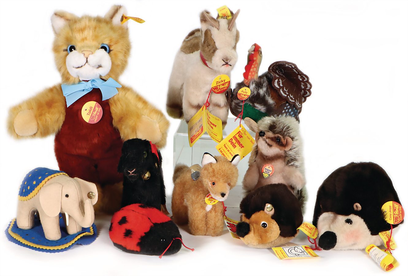 Handmuster aus dem STEIFF Archiv, Archiv-Anhänger, 1680/12, 1978, Putty, mit Schild, Archiv-Anhänger, 3367/14, 1979, Lamm, blanker Knopf, Archiv-Anhänger, 0144/12, 1988, Zicki, komplett, Archiv-Anhänger, 3455/17, 1981, Elefant auf Nadelkissen, mit Knopf, Archiv-Anhänger 0080/08, Replica 1980, Marienkäfer, Knopf und Fahne, Archiv-Anhänger, 5557/10, 1986, Igel, Knopf und Fahne, Archiv-Anhänger, 5558/10, 1986, Cosy Igel, Schild und Fahne, Archiv-Anhänger, 5397/15, 1981, Fuzzy, mit Schild, Anhänger mit Siegel, Werkmuster, 1465/10, 1983, Toldi, Katze, komplett, gelber Knopf, Fahne rückseitig Aufdruck Handmuster, Archiv-Anhänger mit Siegel, Handmuster Produktentwicklung, 6257/27, sehr guter unbespielter Zustand