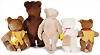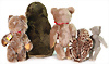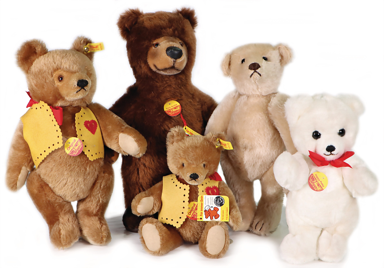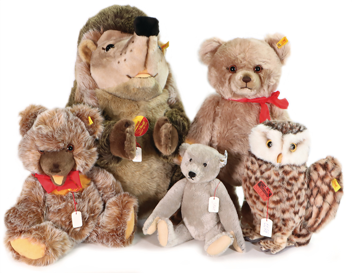 Konv. 5 Art., Bär, grau, mit goldenem Knopf u. weißer Fahne, Brustschild fehlt, Geschmacksmusteranmeldung beim Amtsgericht Nr.3141, 29 cm, Zotty kompl. mit Knopf, Schild u. gelber Fahne, Geschmacksmusteranmeldung beim Amtsgericht, Nr. 3409, 40 cm, Bär mit goldenem Knopf u. gelber Fahne, Schild fehlt, Kippstimme defekt, Geschmacksmusteranmeldung beim Amtsgericht, Nr. 3596, Eule, Brustschild Studio, mit goldenem Knopf u. gelber Fahne, Geschmacksmusteranmeldung beim Amtsgericht, Nr. 3077, 28 cm, Joggi, kompl. mit Knopf, Schild u. gelber Fahne, Geschmacksmusteranmeldung beim Amtsgericht, Nr. 3744, 55 cm, schönes Konv.