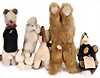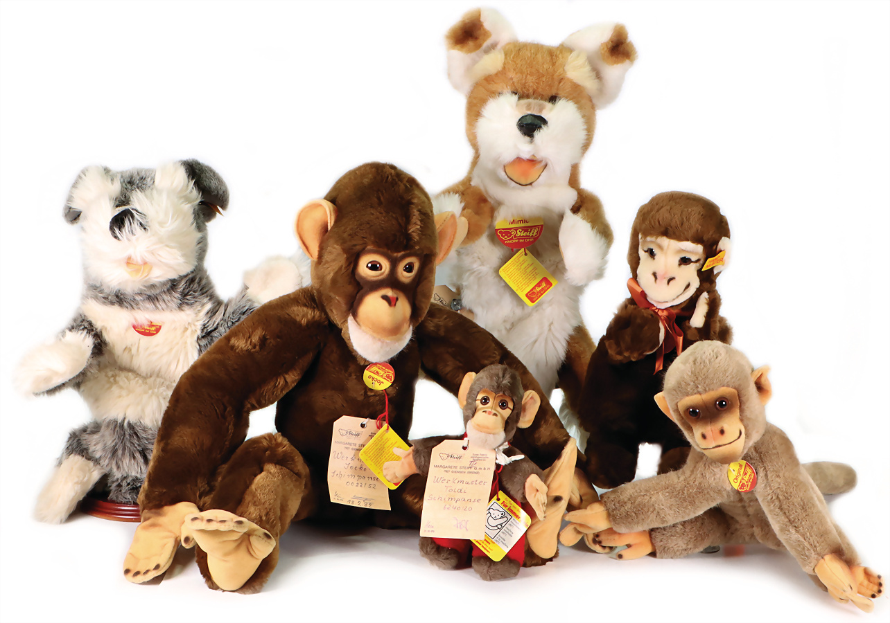 Konv. 4 Affen, Jocko, mit Brustschild, Werkmusterschild u. Handmustersiegel, Artikel-Nr. 0022/25, 55 cm, Happy Affe Handspielpuppe, mit Knopf, Schild u. gelber Fahne, Aufschrift Handmuster, mit Handmusterschild u. Metallsiegel, 28 cm, Pavian, mit Brustschild u. Archiv-Anhänger, 25 cm, Affe, Toldi, mit Brustschild, Werkmusterschild u. Metallsiegel, 18 cm, 1x Jolly, Hund, Brustschild, Knopf u. gelbe Fahne, Aufdruck Handmuster, mit Handmusterschild u. Metallsiegel, Artikel-Nr. 25086, 40 cm, Mimik, Hund, mit Brustschild, Werkmusterschild u. Metallsiegel, Artikel-Nr. 3492/45, 40 cm, Handmuster aus dem STEIFF Archiv, mit orig. STEIFF Archiv-Anhänger