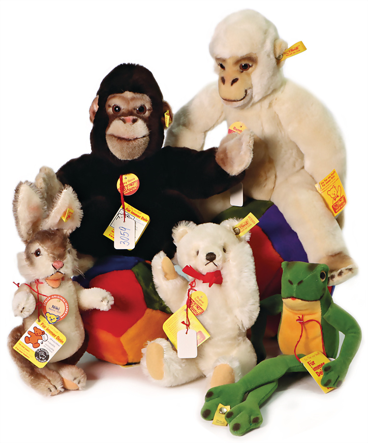Konv. 7 Art., 90er Jahre, Hase Niki kompl., Knopf, Schild u. gelbe Fahne, mit Anhänger „Für immer Dein“, neuw. Zust., Geschmacksmusteranmeldung beim Amtsgericht, Nr. 3457, Ball mit Anhänger, „Für immer Dein“, Geschmacksmusteranmeldung beim Amtsgericht, Nr. 3233, Ball mit Anhänger „Für immer Dein“, Geschmacksmusteranmeldung beim Amtsgericht, Nr. 3232, Teddy-Bär kompl. mit Knopf, Schild u. gelber Fahne, mit Anhänger „Für immer Dein“, Geschmacksmusteranmeldung beim Amtsgericht, Nr. 3149, 23 cm, Frosch, mit Anhänger „Für immer Dein“, gelbe Fahne, Geschmacksmusteranmeldung beim Amtsgericht, Nr. 2877, 31 cm, Affe, Bamboo kompl. mit Knopf, Schild u. gelber Fahne, Anhänger „Ein Tier von STEIFF für immer Dein“, Geschmacksmusteranmeldung beim Amtsgericht, Nr.3614, 43 cm, Affe Cosy Gora kompl. mit Brustschild, Knopf und gelber Fahne, mit Anhänger „Für immer Dein“, Geschmacksmusteranmeldung beim Amtsgericht, Nr. 3059, 30 cm, schönes Konv.